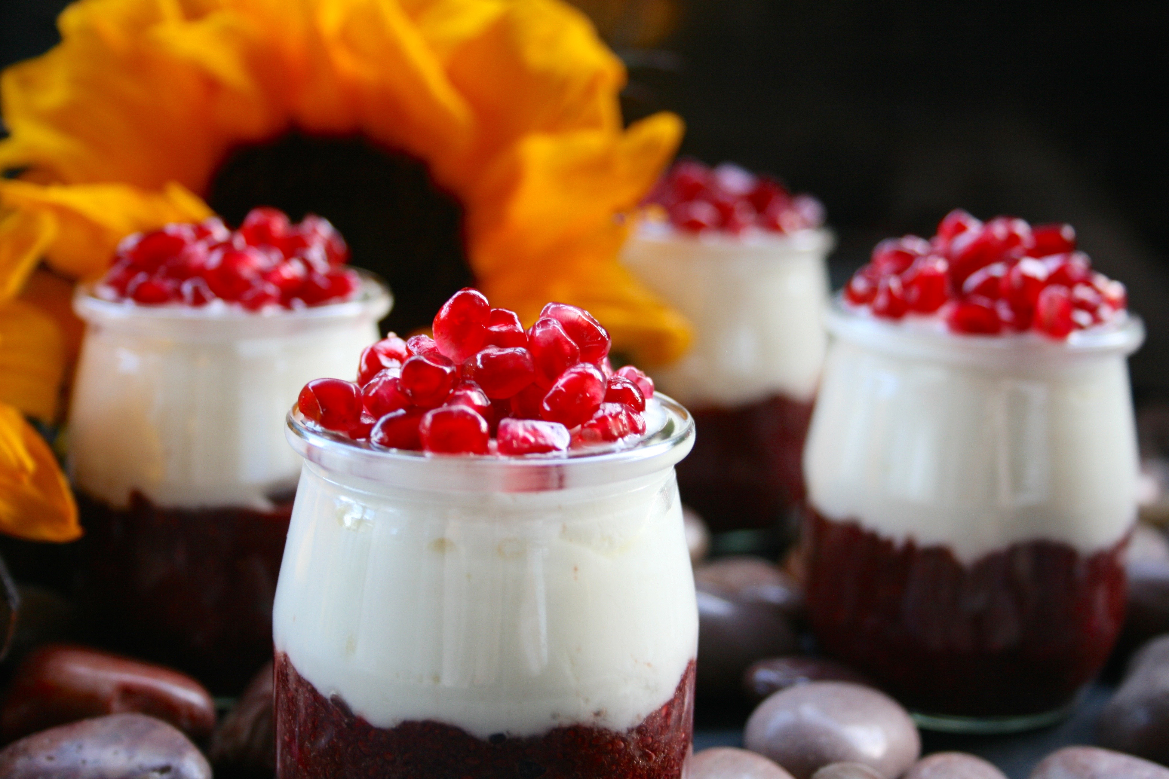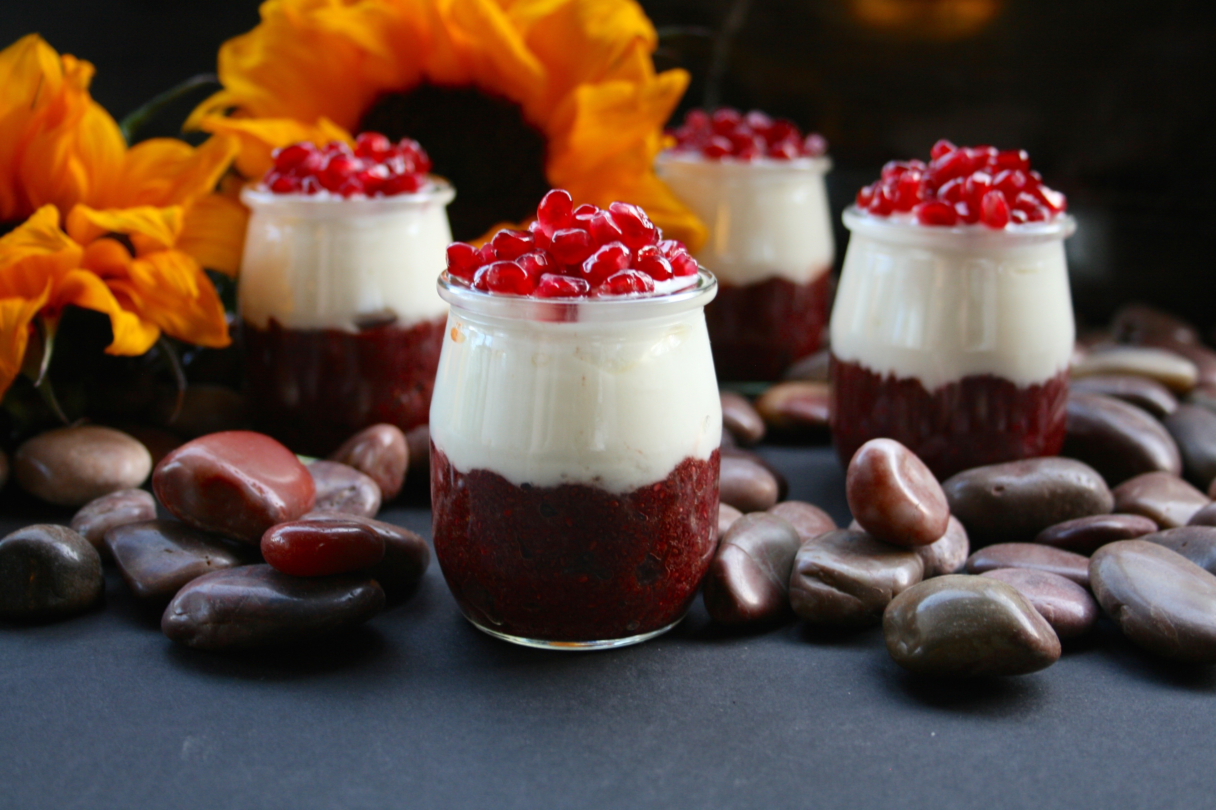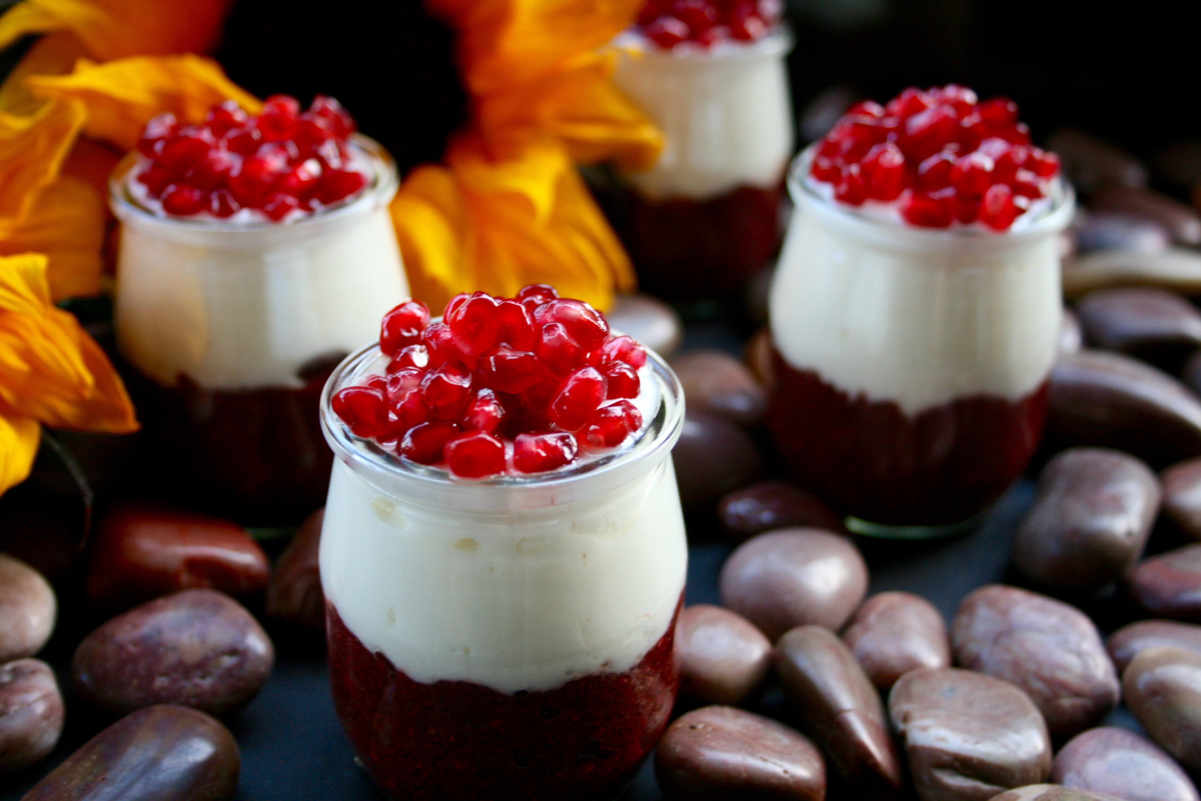 These Canada Day inspired parfaits are made from layers of chia pudding, yogurt and pomegranate arils. The chia pudding at the base is only three ingredients- puréed cherries and strawberries with chia seeds. A little maple syrup would be the perfect addition for some extra sweetness.Chia pudding can basically be made from any liquid combined with enough chia seeds to plump up and turn the liquid into a gelatinous pudding. Fruits with a high enough water content to become liquified like berries work well.Small servings like this are ideal for pre- or post- workouts to consume several nutrients quickly in an easy-to-digest package. They are also a healthy option for breakfast, brunch and luncheon buffets. I used plain Greek yogurt for it’s thick texture, high protein content and probiotics but coconut or almond based yogurts are good dairy-free options.