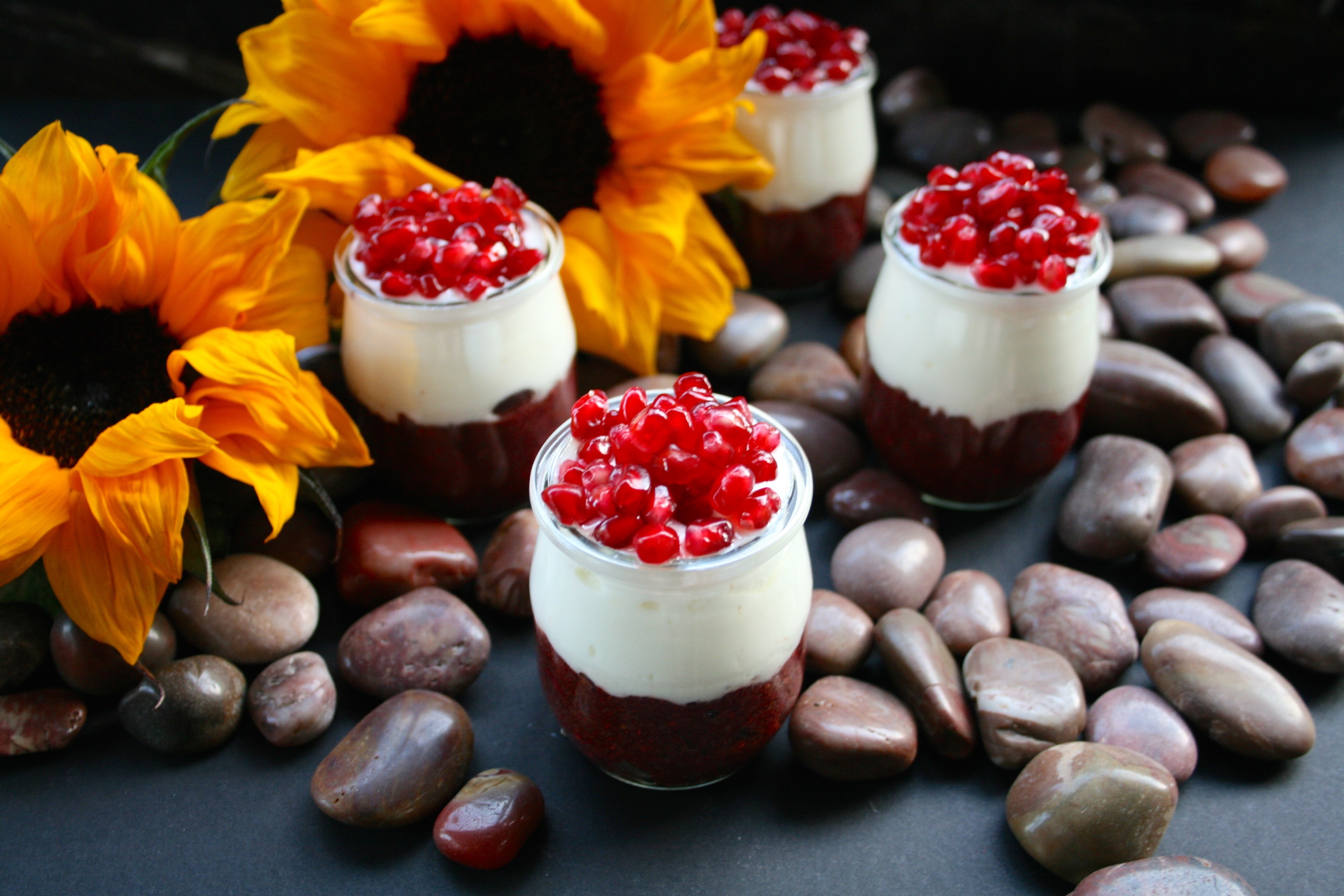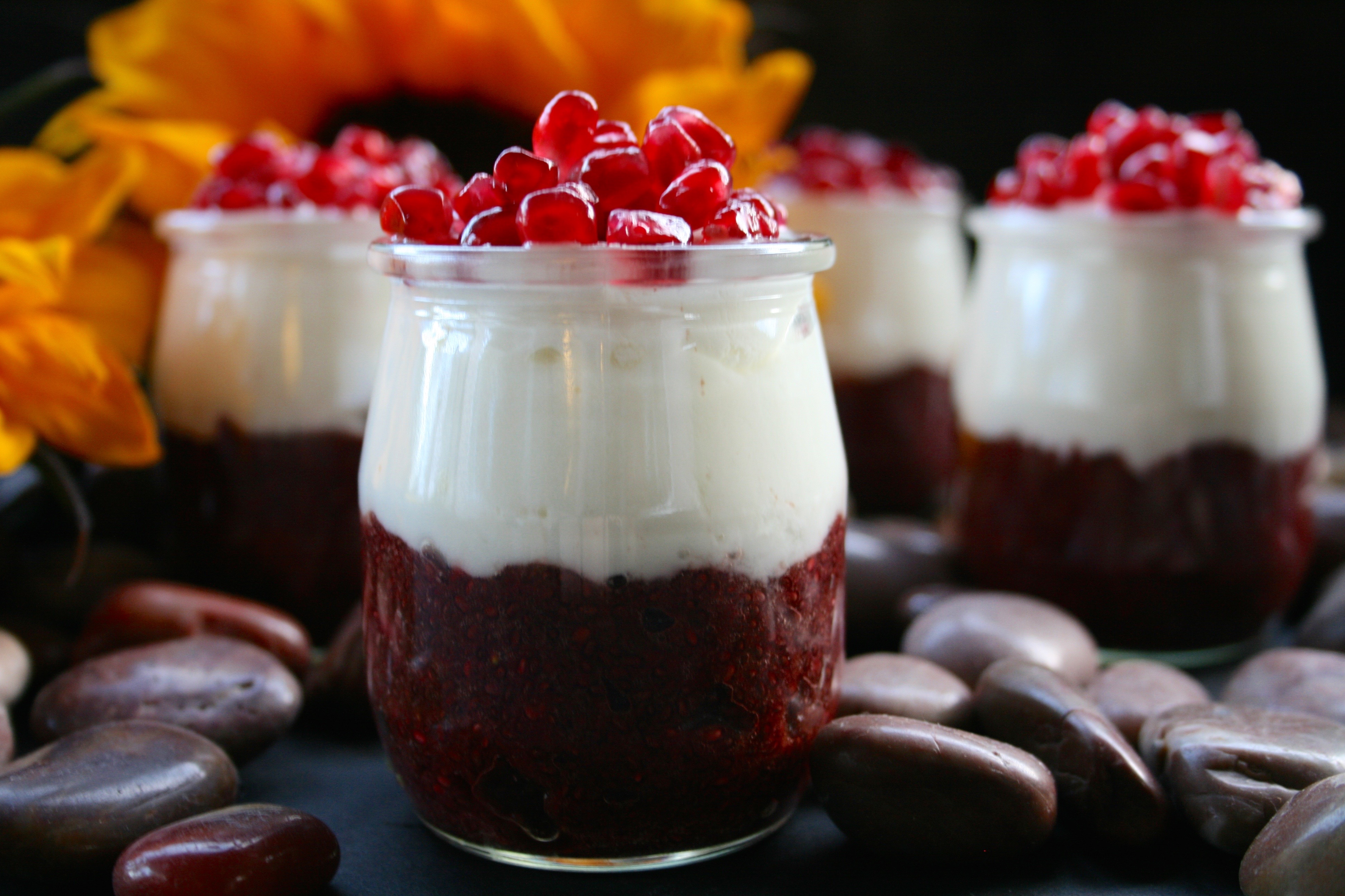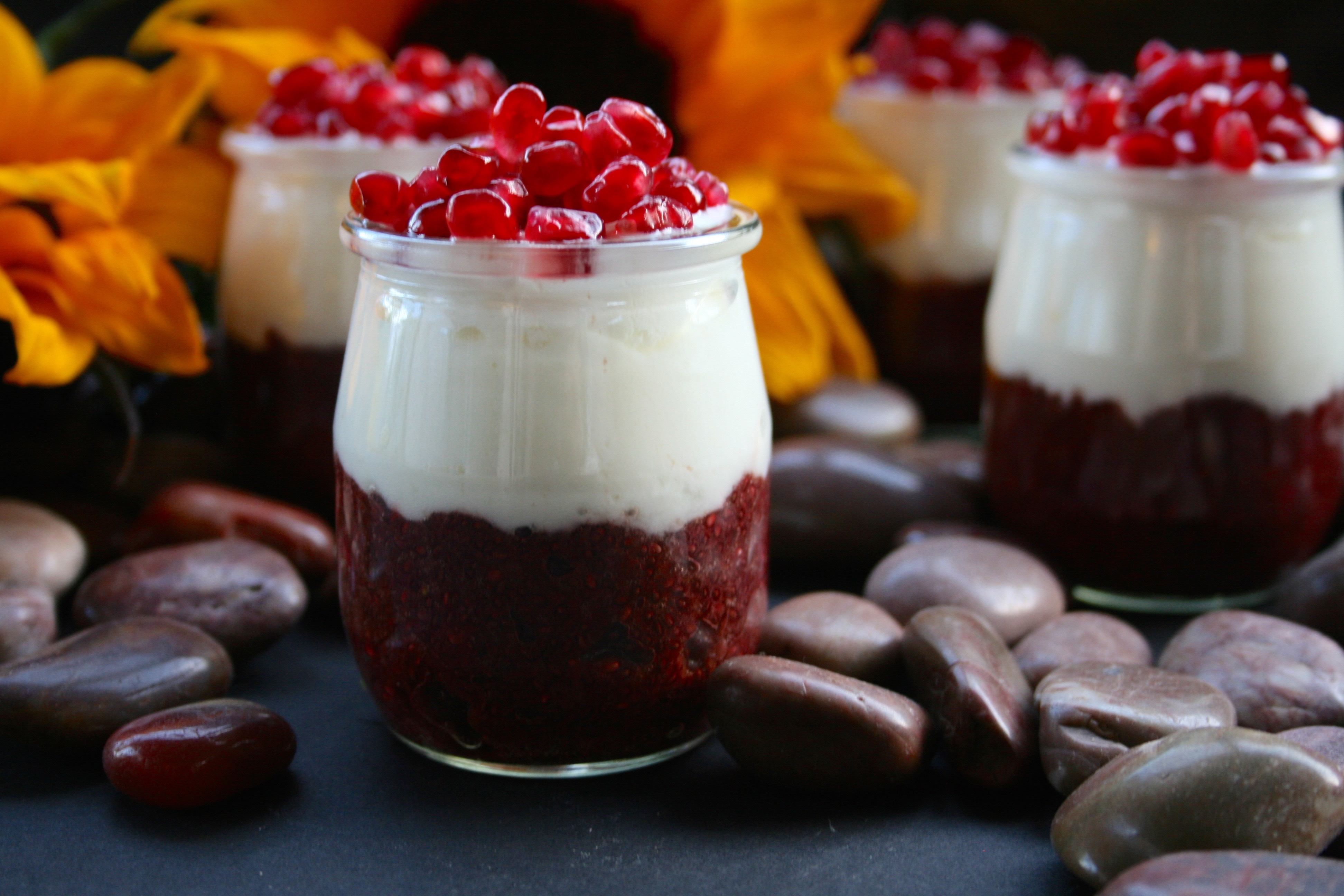 These Canada Day inspired parfaits are made from layers of chia pudding, yogurt and pomegranate arils. The chia pudding at the base is only three ingredients- puréed cherries and strawberries with chia seeds. A little maple syrup would be the perfect addition for some extra sweetness.Chia pudding can basically be made from any liquid combined with enough chia seeds to plump up and turn the liquid into a gelatinous pudding. Fruits with a high enough water content to become liquified like berries work well.Small servings like this are ideal for pre- or post- workouts to consume several nutrients quickly in an easy-to-digest package. They are also a healthy option for breakfast, brunch and luncheon buffets. I used plain Greek yogurt for it’s thick texture, high protein content and probiotics but coconut or almond based yogurts are good dairy-free options.