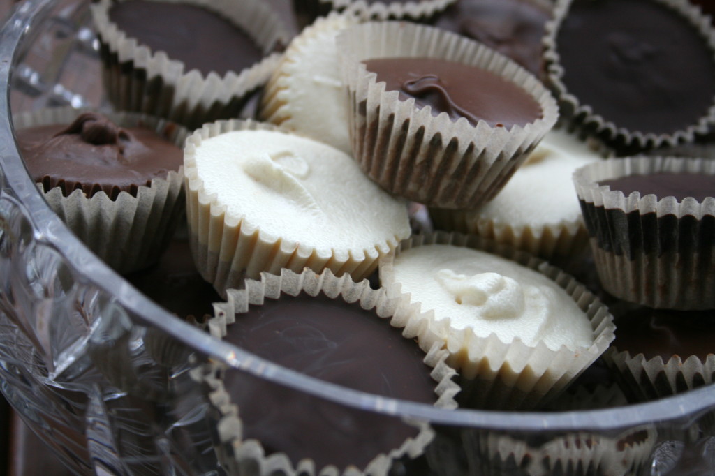 - Melt the chocolate in a medium pot over low heat, stirring constantly (especially if using white chocolate- it burns the easiest). Once fully melted, spoon 1 tablespoon of the chocolate over each peanut butter cup and use the back of the spoon to push it out to the edges so that it is even. Set aside for about an hour for the chocolate to harden back up. Store in the fridge for a few days or the freezer for longer but let it come to room temperature before serving so that the chocolate is soft enough to bite into.