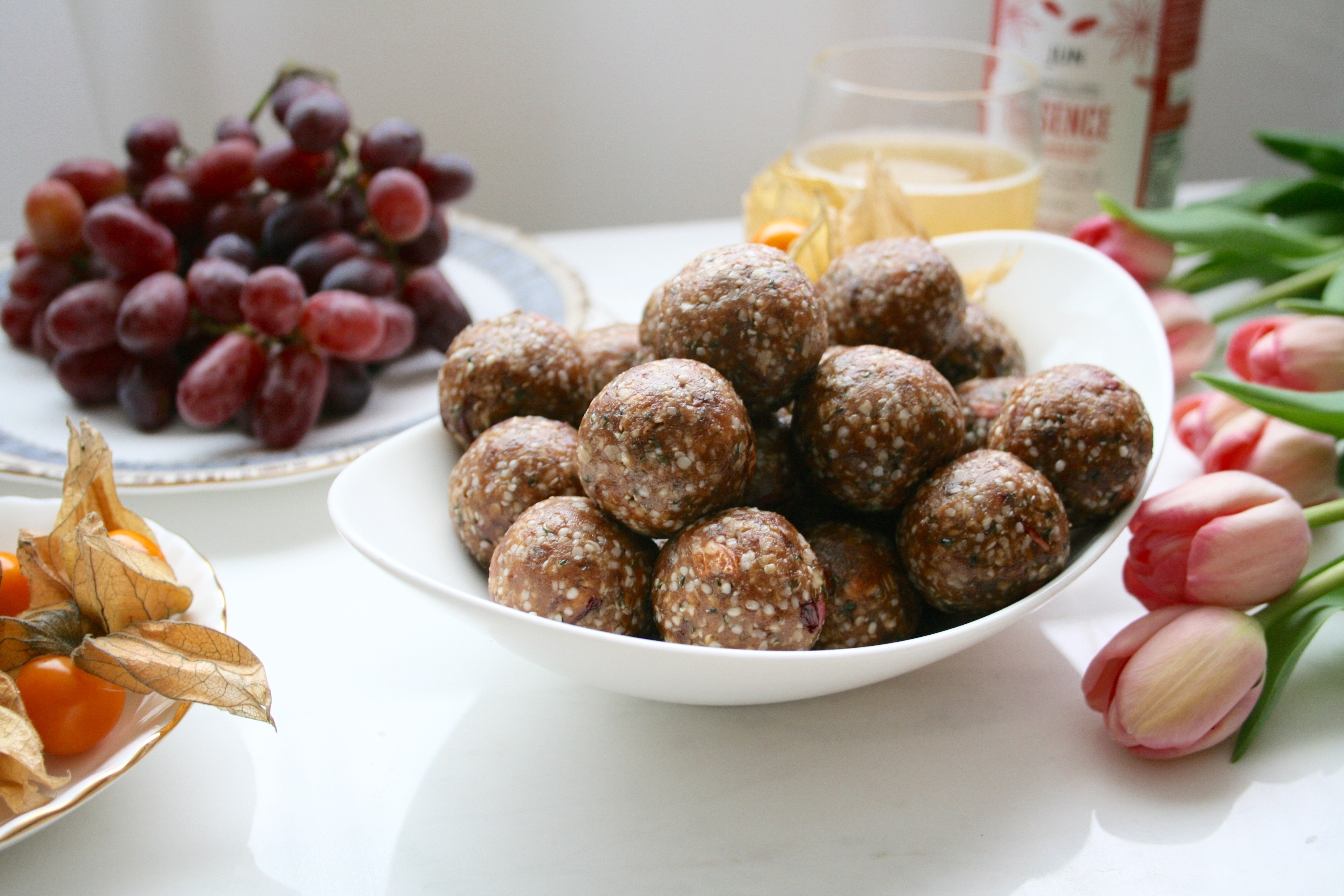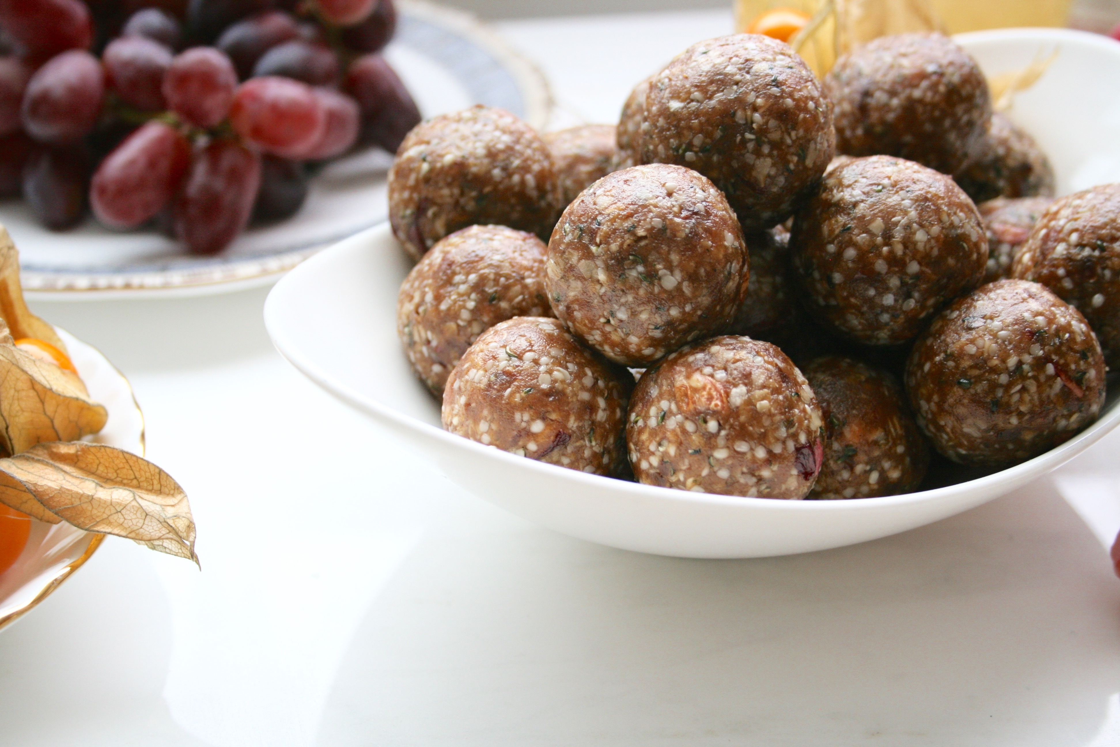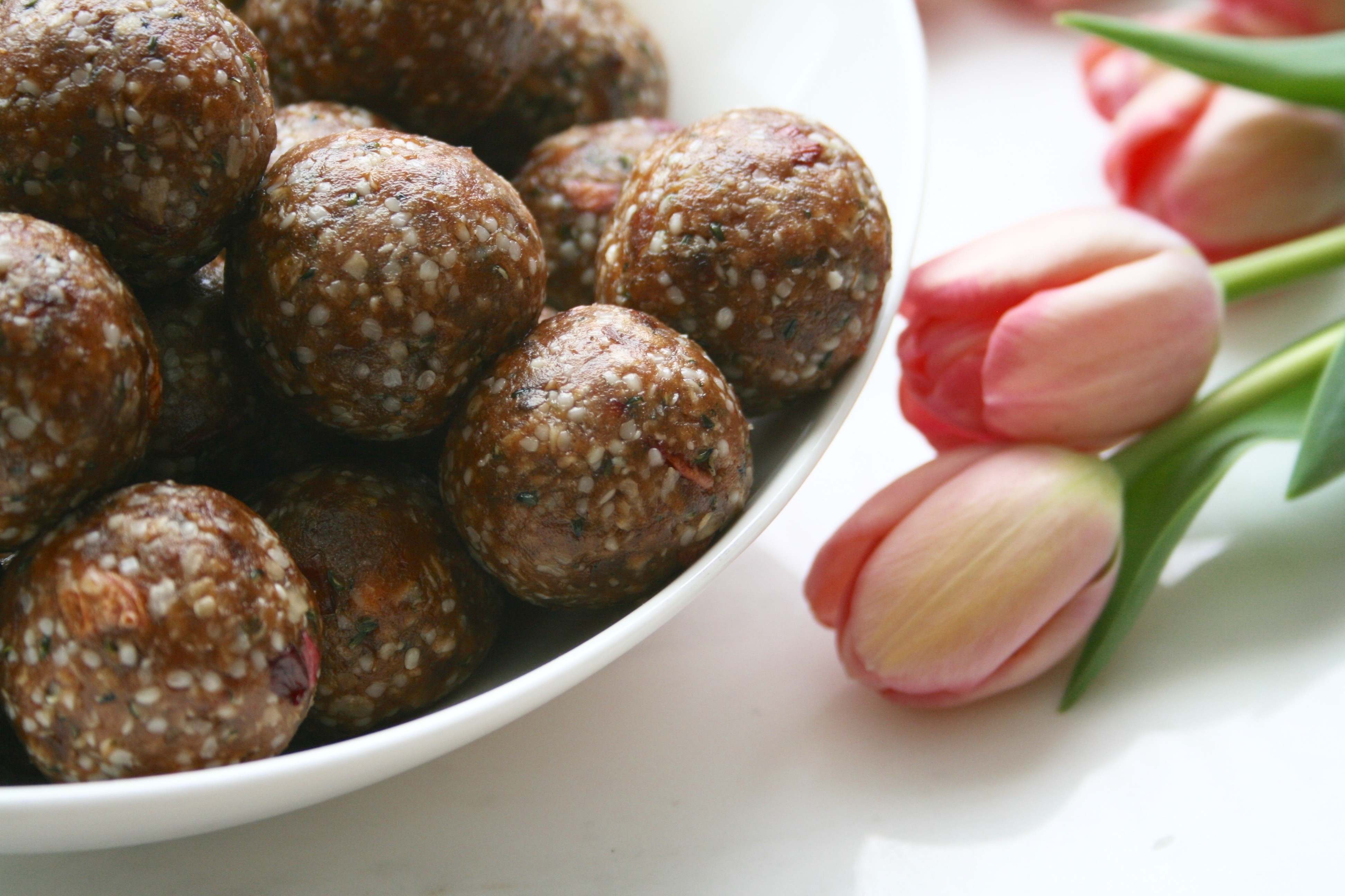 Energy balls can be made with any combination of dried fruits, nut butters, seeds, nuts and whole grain flakes or puffs. They are basically trail mix in another form, though they are just as portable and convenient. I find that they can even be a bit easier to digest because everything is chopped finely. Generally, we do not chew our food enough, putting more stress on the rest of the digestive system to break down each bite. Since nutrient dense snacks like this are ideal for when on the go, or pre- or post- workout, the more easily digestible they are the better. I especially like them with some good kombucha (brilliant helper for the digestive system) and if I need a bit extra I’ll have some fresh fruit on the side or mix them into oatmeal or yogurt.