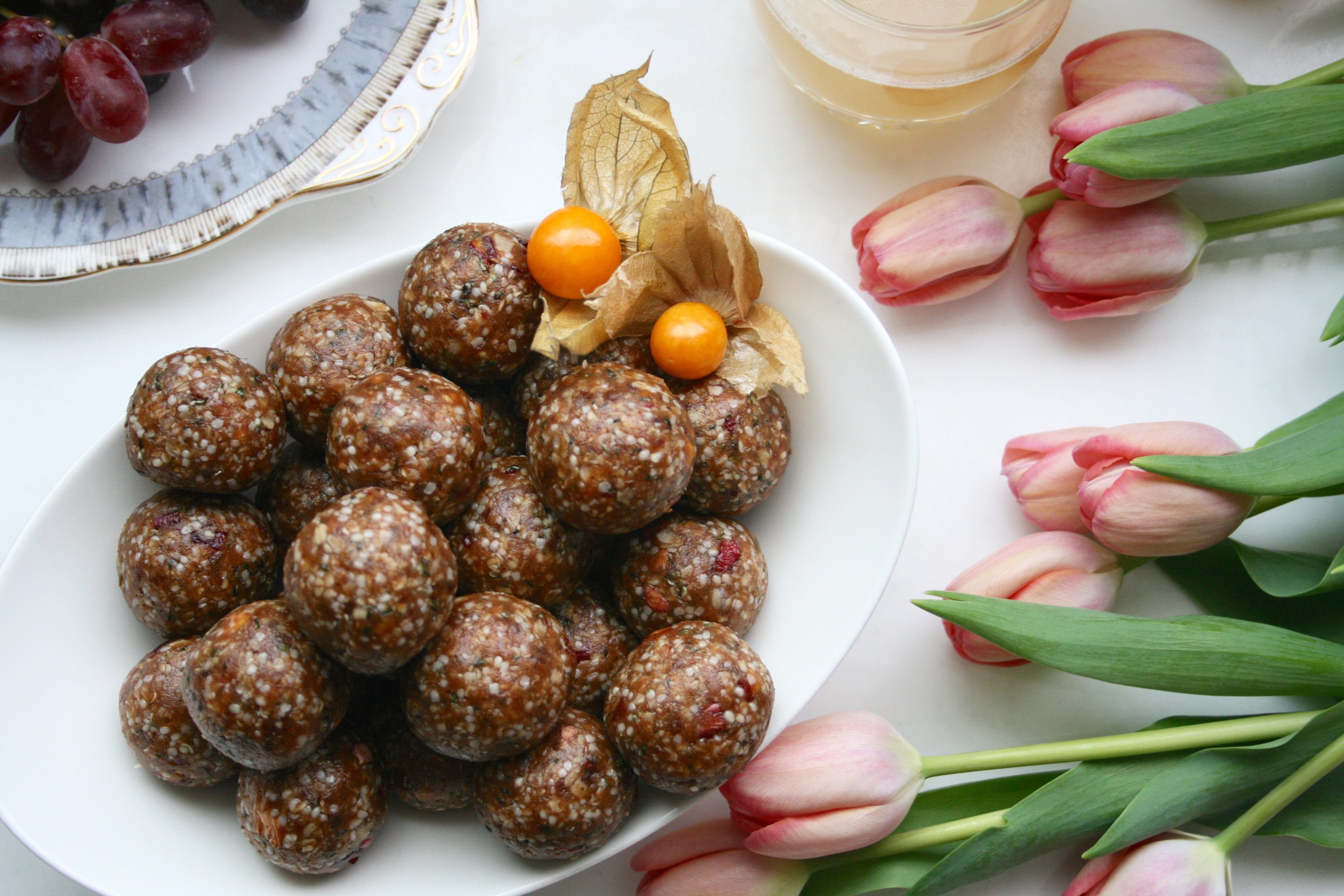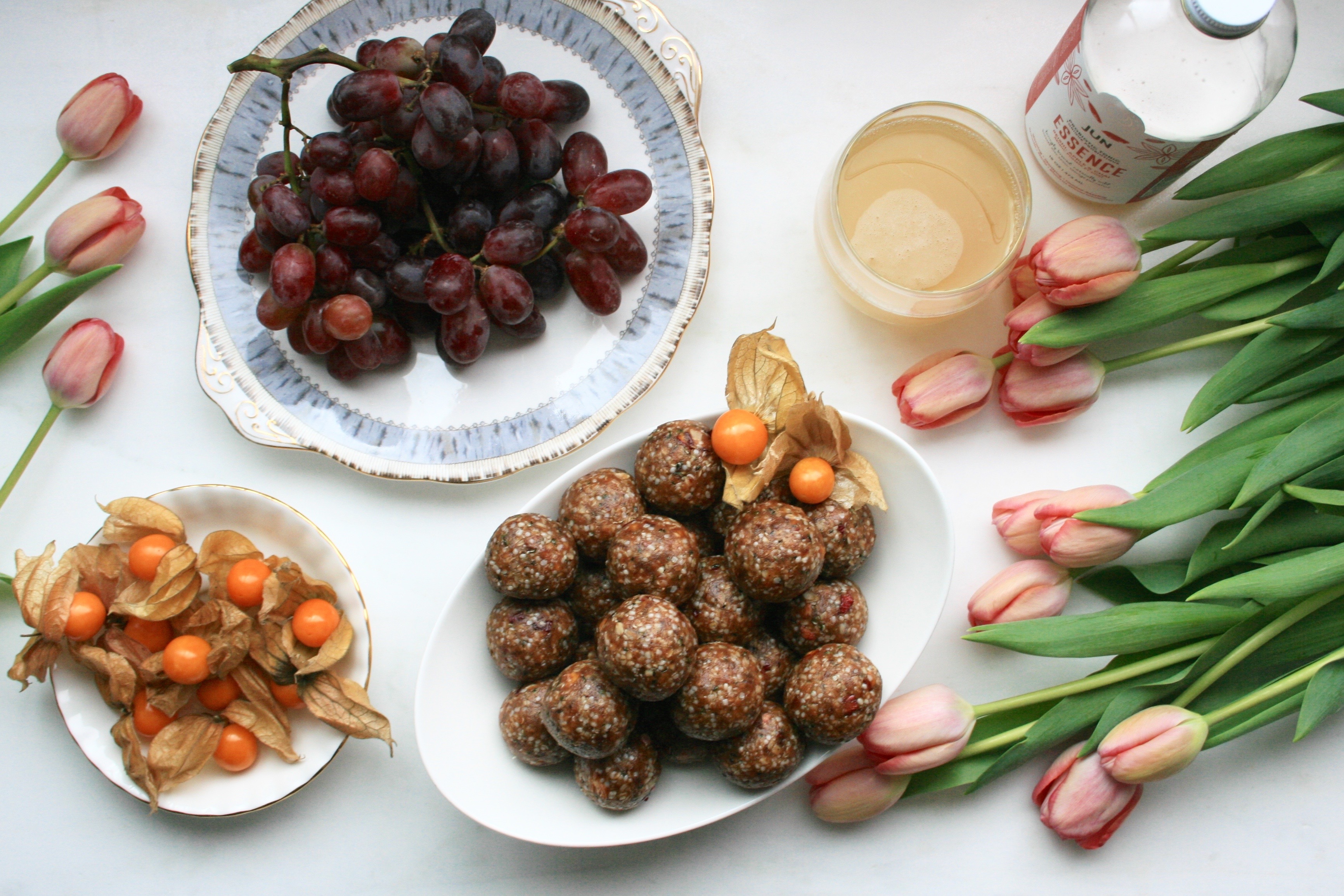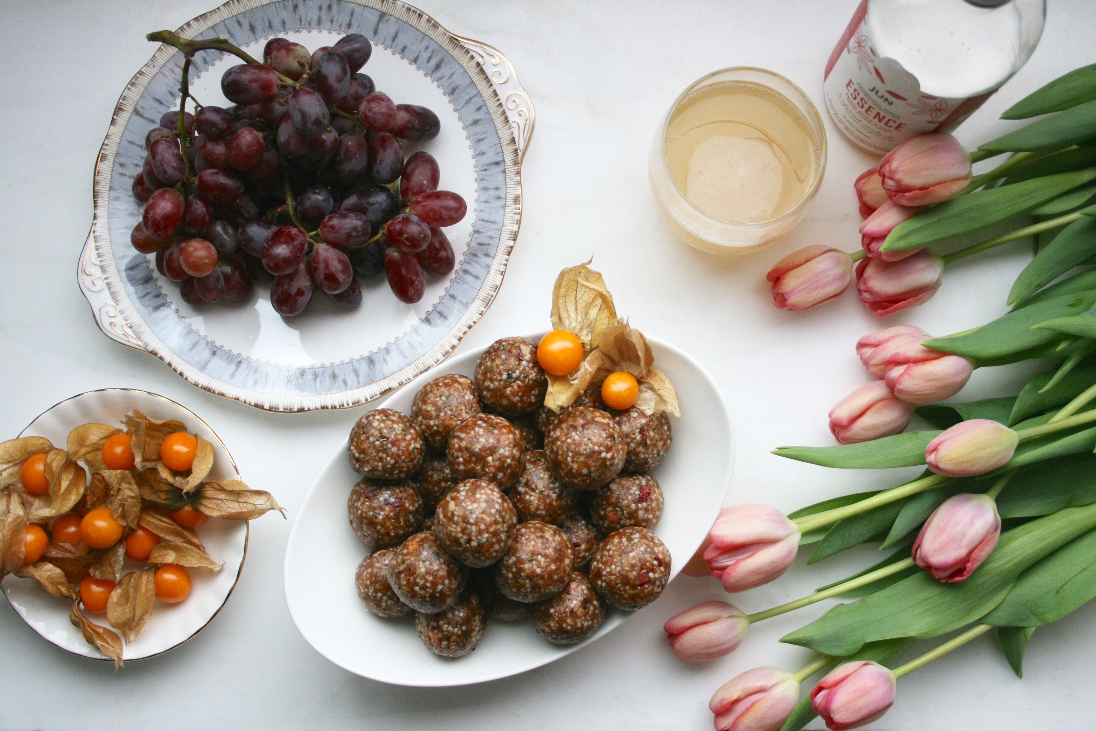 Energy balls can be made with any combination of dried fruits, nut butters, seeds, nuts and whole grain flakes or puffs. They are basically trail mix in another form, though they are just as portable and convenient. I find that they can even be a bit easier to digest because everything is chopped finely. Generally, we do not chew our food enough, putting more stress on the rest of the digestive system to break down each bite. Since nutrient dense snacks like this are ideal for when on the go, or pre- or post- workout, the more easily digestible they are the better. I especially like them with some good kombucha (brilliant helper for the digestive system) and if I need a bit extra I’ll have some fresh fruit on the side or mix them into oatmeal or yogurt.