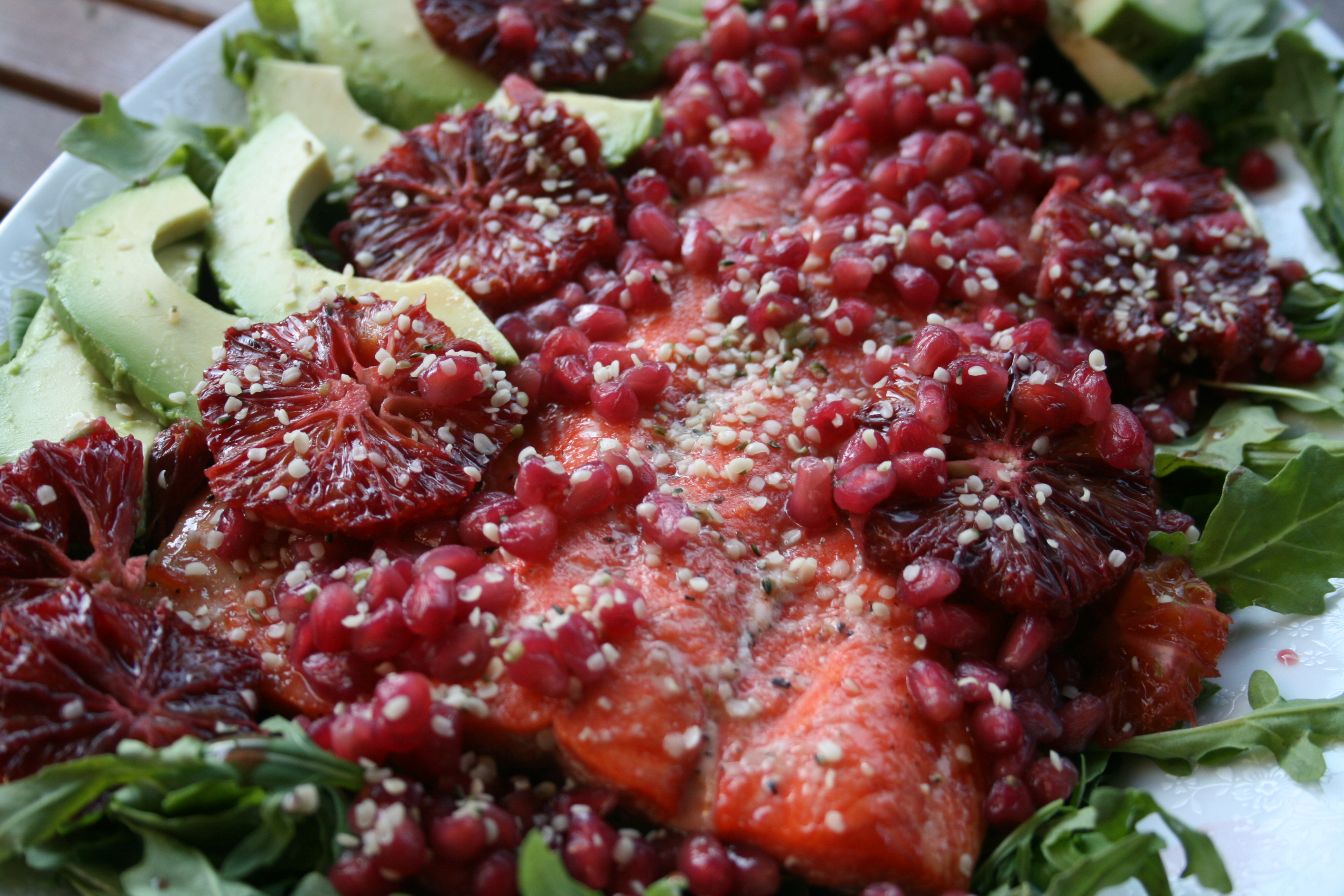 - Plate the salmon on a bed of arugula and serve with the stewed fruit (remove the cloves, allspice and cinnamon), avocado and hemp hearts sprinkled on top.