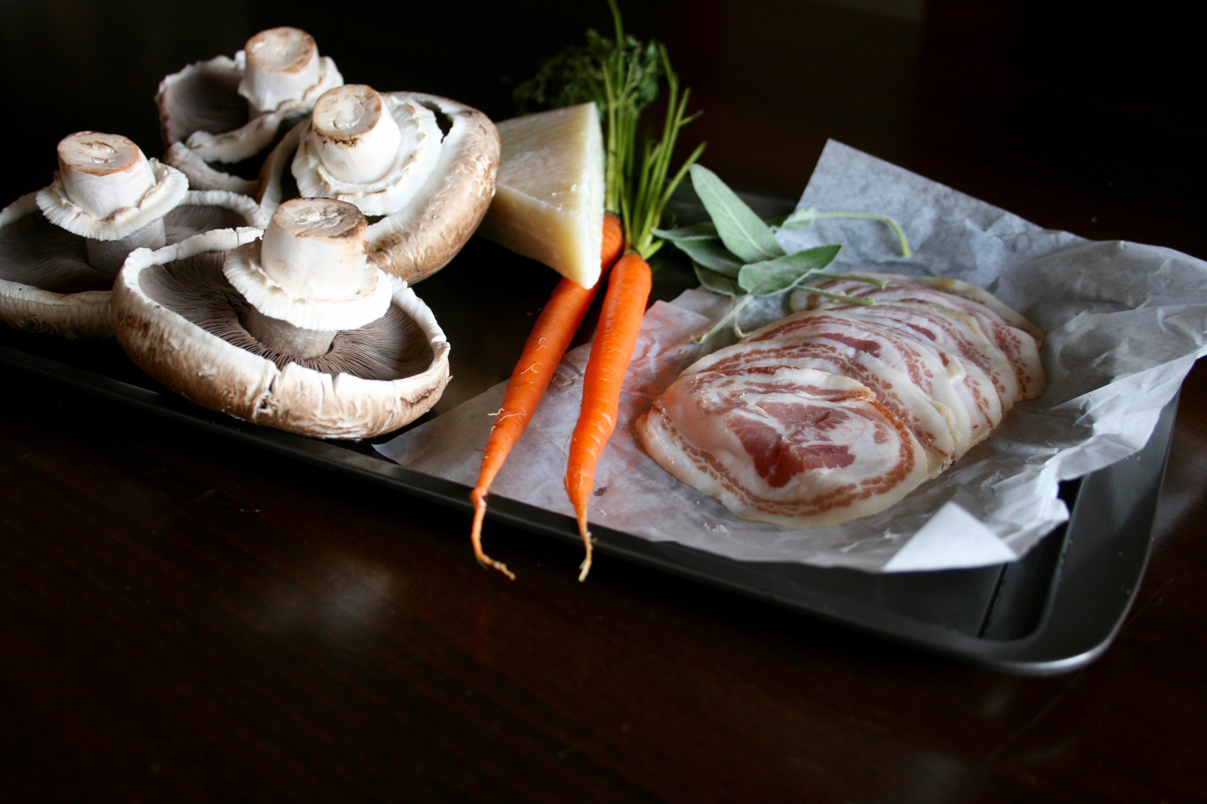 - Once the rice is done, it should be soft and all the liquid should be absorbed, add in the carrots, cheese and sage. Add in the pancetta, breaking it into small bits as you go then mix it all together and spoon into the mushroom caps. Place in the oven and bake for 25 minutes. Serve hot with the option of a sprinkle of sliced fresh parsley.