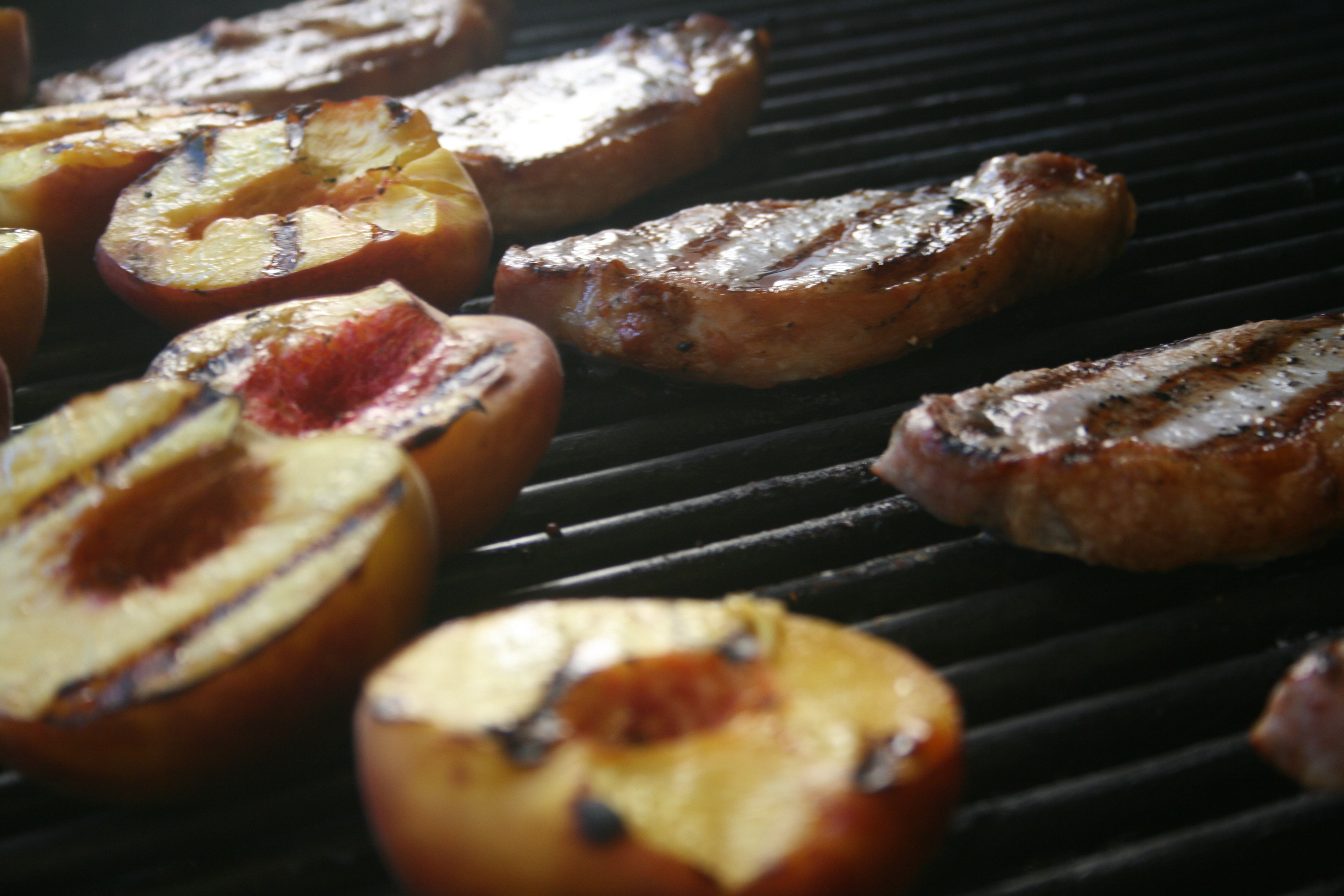 - minutes- flip the pork and place the peaches on the grill