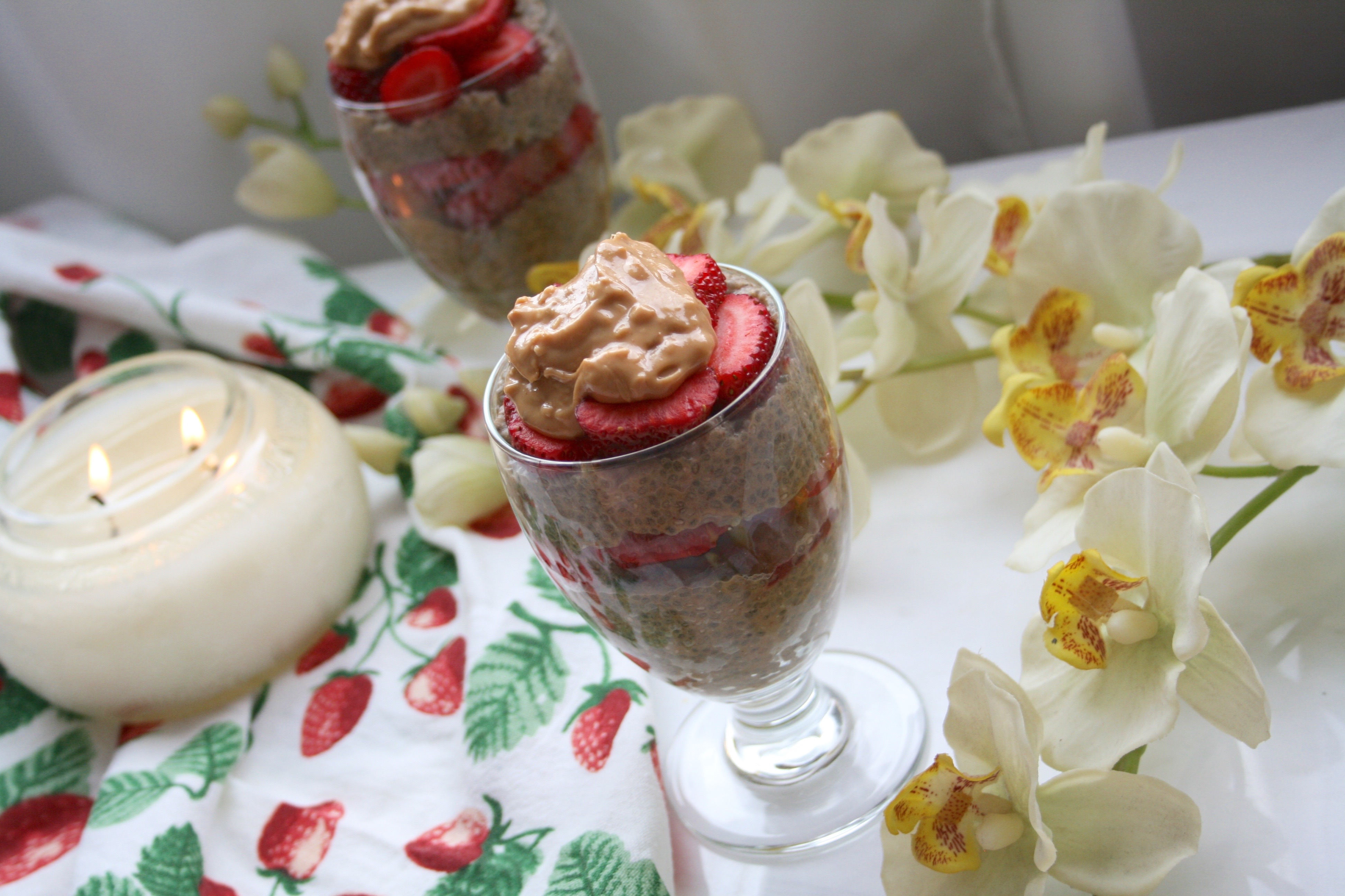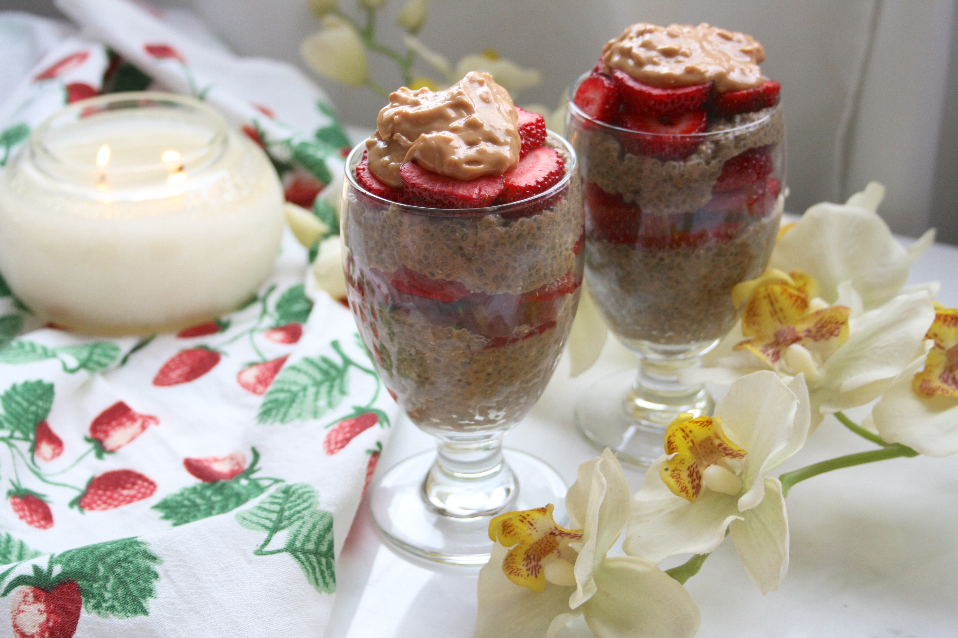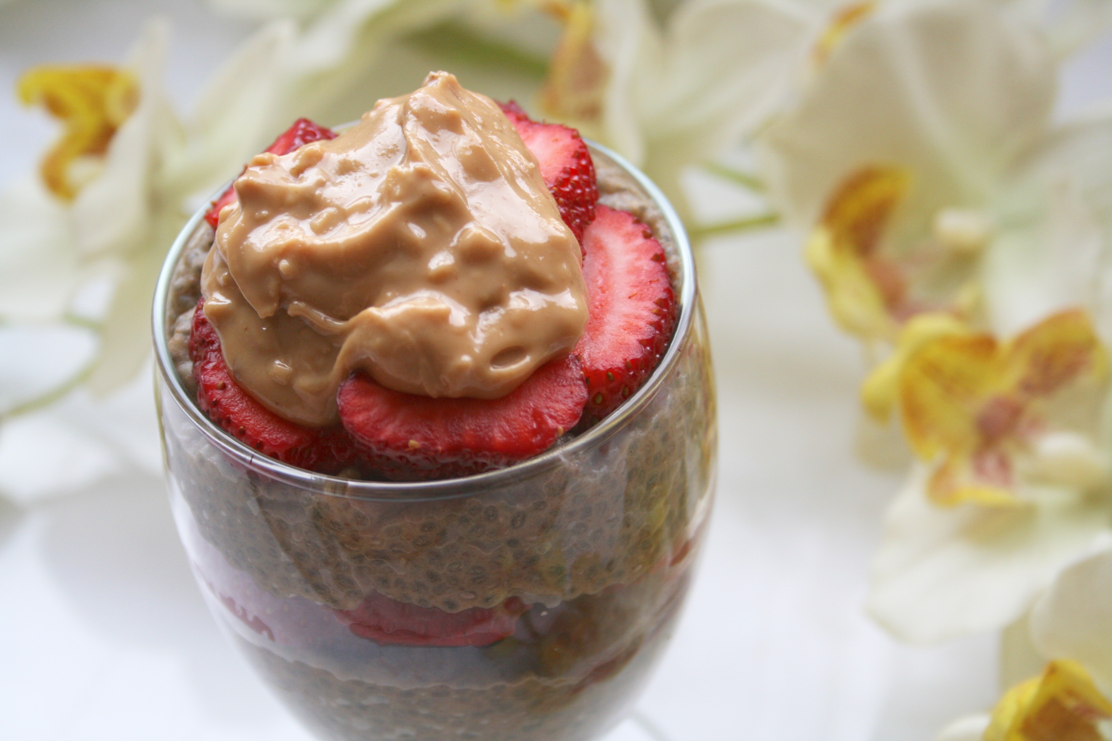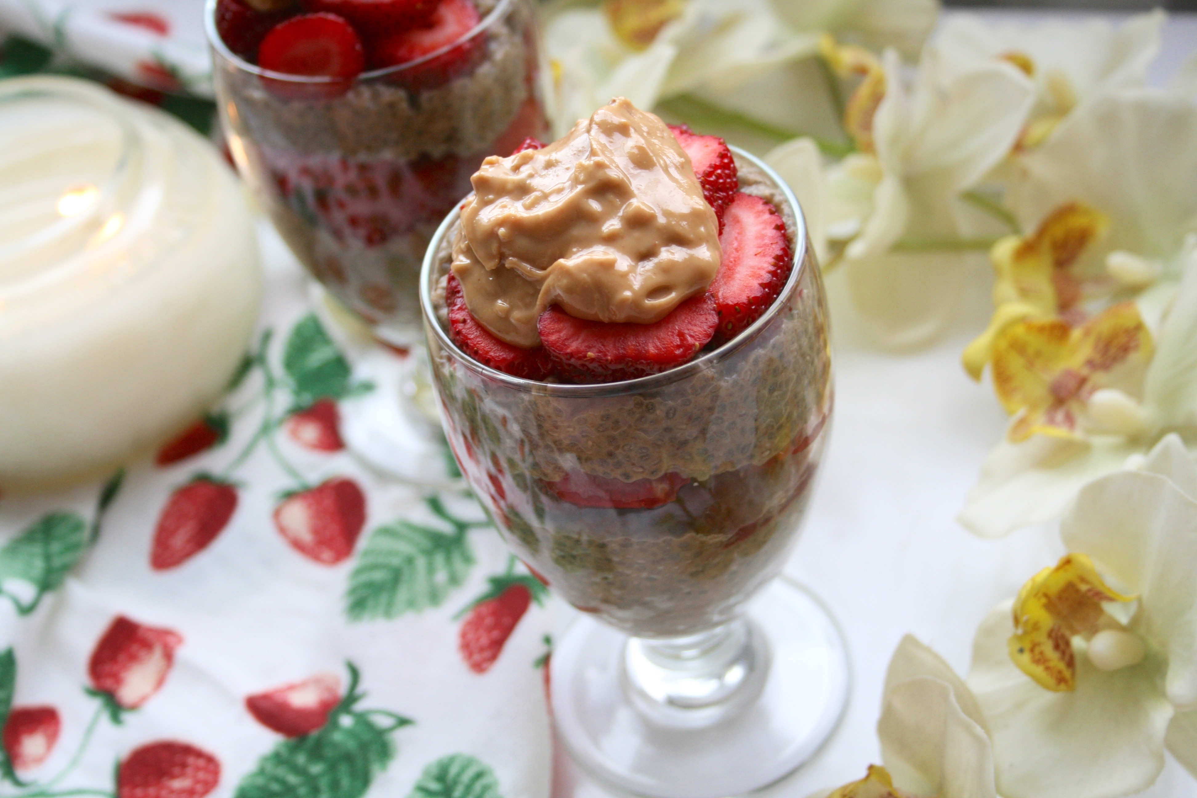 - Layer the pudding by placing the first two quarters into two jars or bowls then top with ½ cup strawberries each, followed by the final two quarters of chia pudding and the rest of the strawberries. Finish them off with a dollop each of peanut butter.