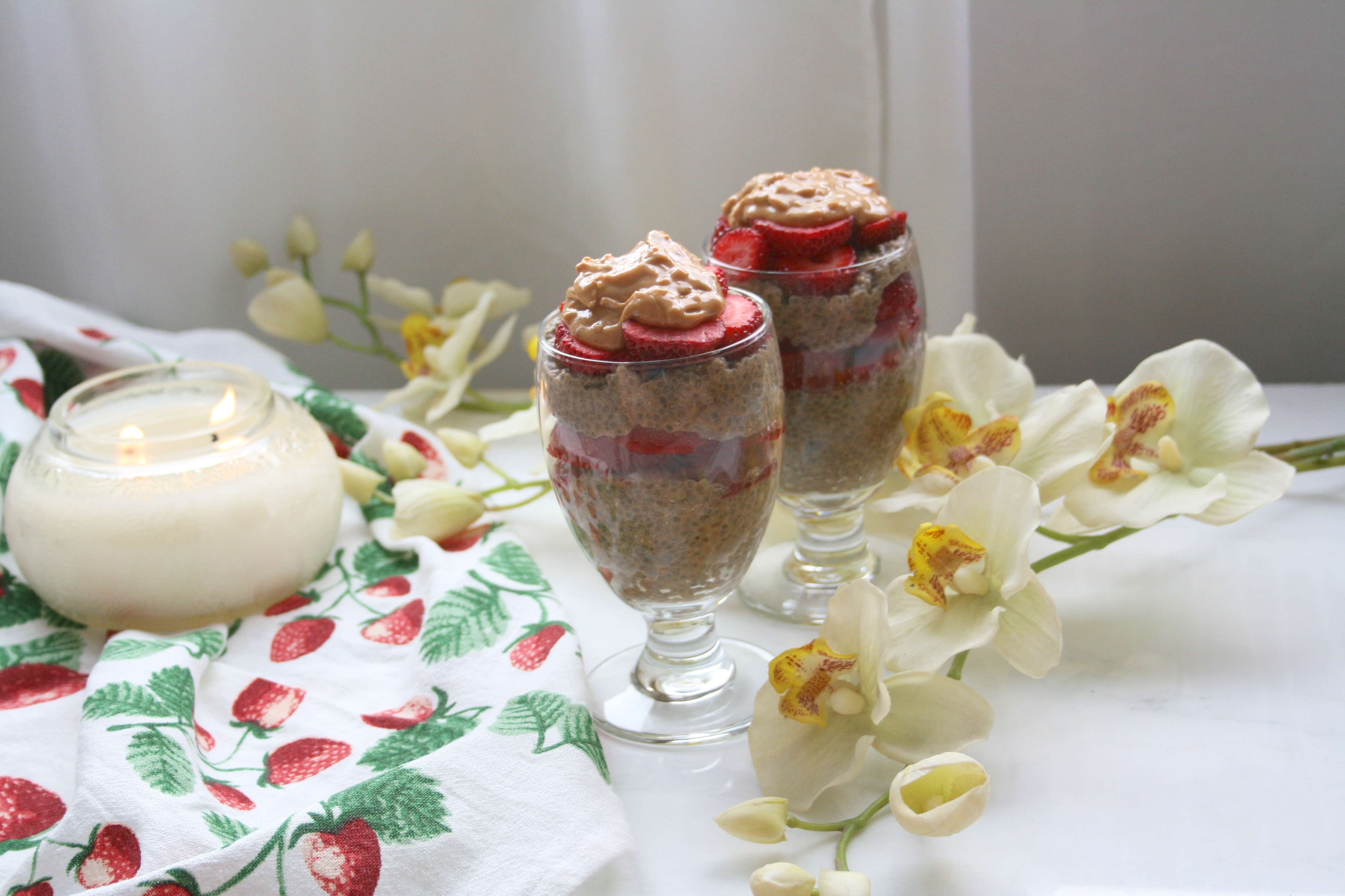 Layering peanut chia pudding with fresh strawberries makes for a PB and J inspired healthy treat. They contain a very healthy amount of fiber, good fats and protein which make chia pudding both satiating and satisfying. Some Medjool dates make it naturally sweet and add in some extra nutrients while a combination of peanut powder and peanut butter give it a strong peanut flavour and variety of textures.