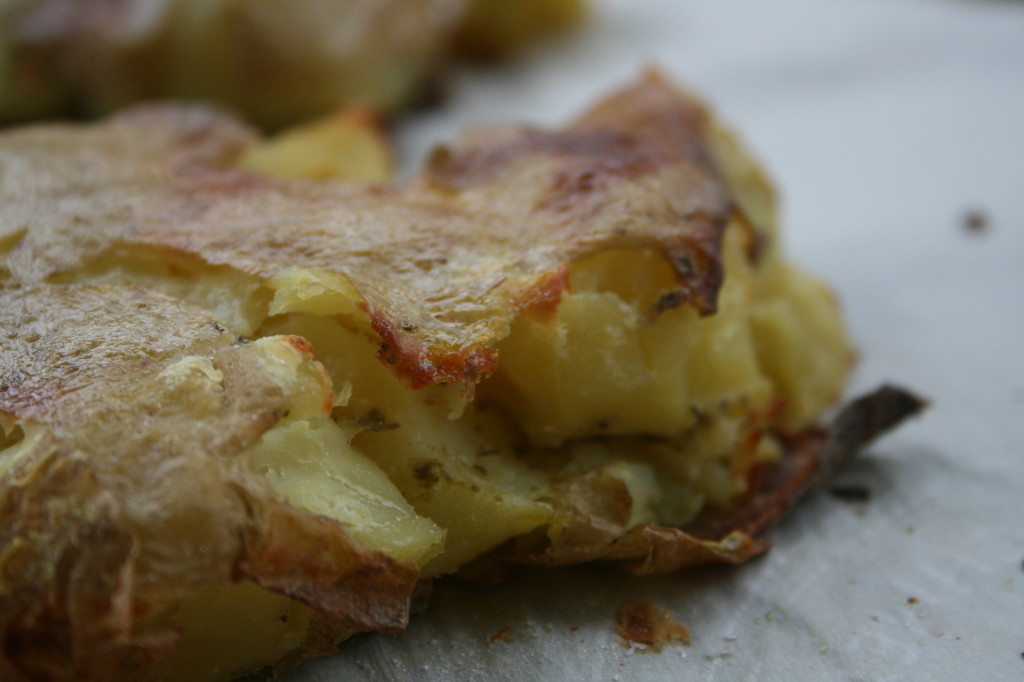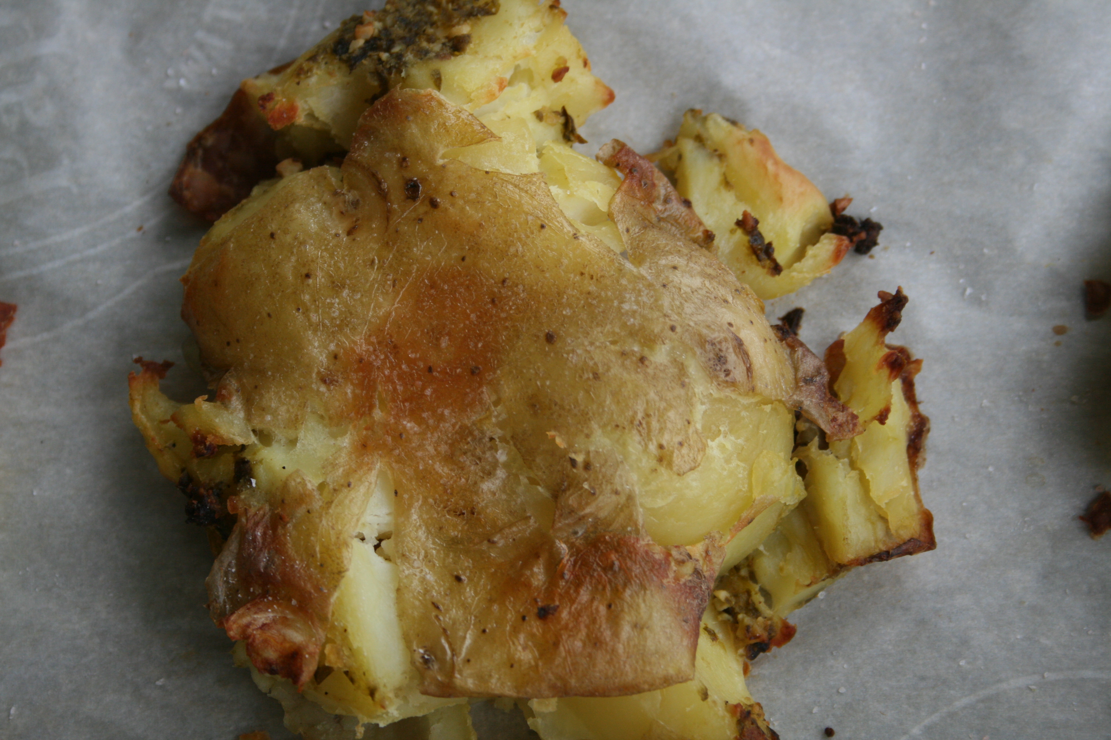 - Fill a large pot ⅔ full of water with a dash of salt and heat to boiling on the stove over high heat. Add in the potatoes and continue to boil for 20-25 minutes, until they are cooked through, then set aside to cool for a few minutes. Preheat oven to 400°. Cut a slit into each potato, about halfway through but not all the way to the back. Add a teaspoon of pesto into each slot then space them out evenly on a parchment lined baking sheet, with the slits parallel to the bottom of the sheet. Use a paper towel, folded over in your hand for grip and press down into the top of each potato until they smush down, this should with very little effort as long as they are cooked enough. Drizzle a teaspoon of the oil over each potato and sprinkle with a bit of sea salt then bake for 25-30 minutes, until crispy and golden brown.