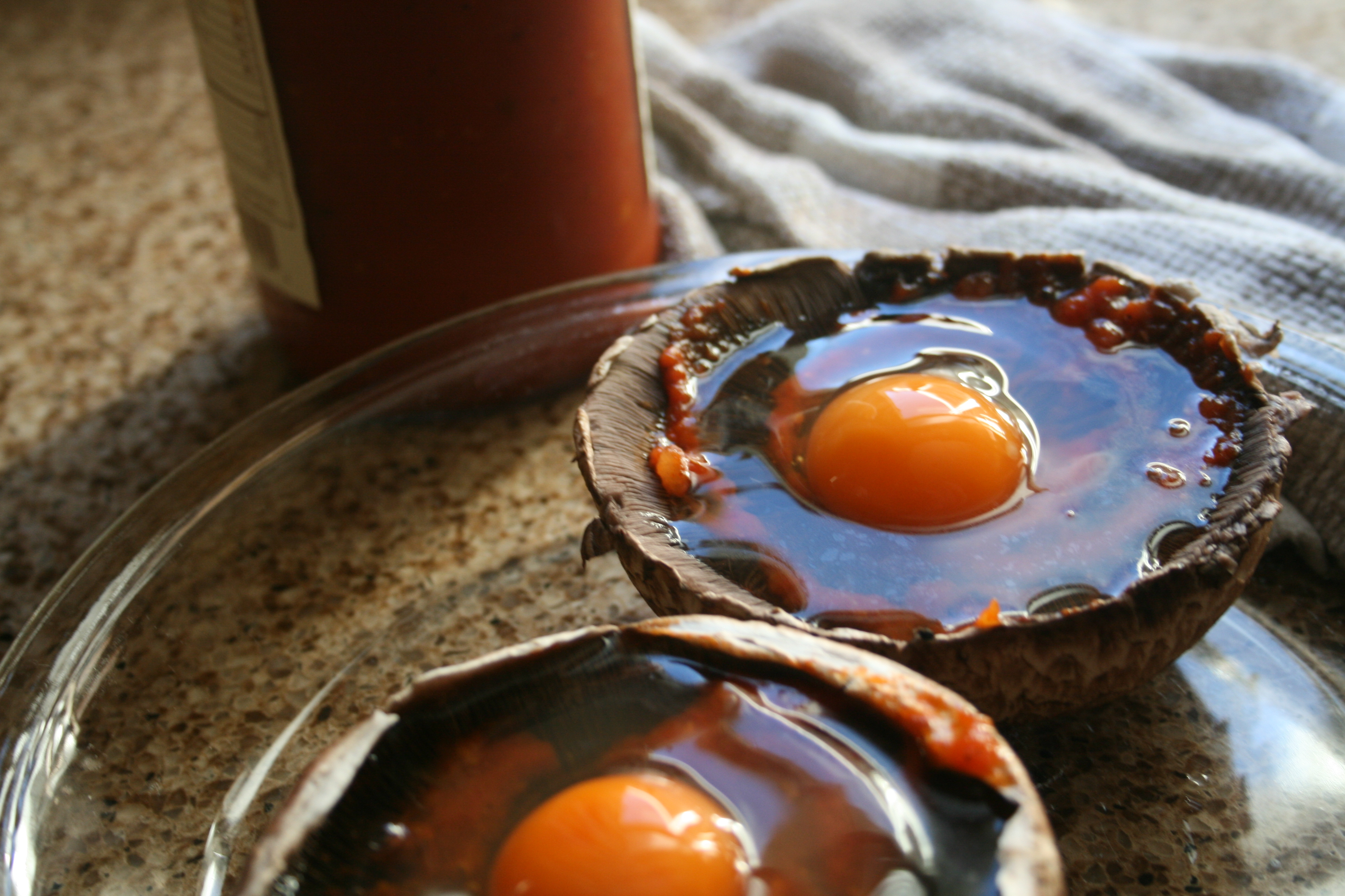 1. Preheat oven to 400°. Pull the stems off the portobellos and put them in a baking dish, top sides down. Spread 1 tablespoon of tomato sauce on each mushroom then break an egg over top and bake for 20-25 minutes, until the eggs are set.