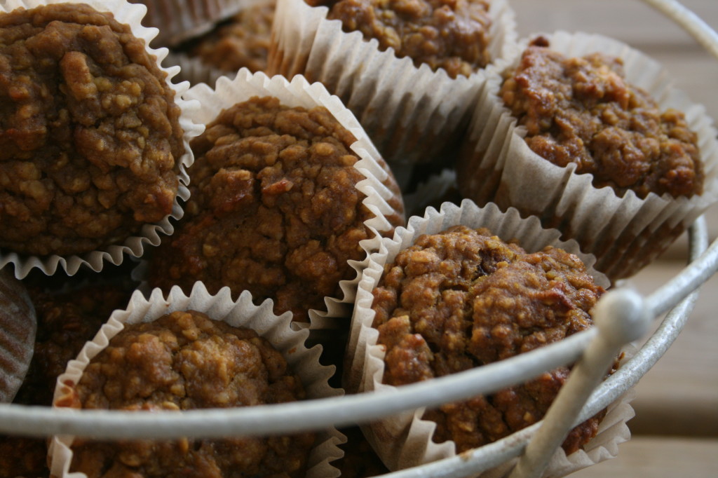 My solution is to have something healthy like these muffins around that I can grab and eat at my convenience. The main ingredients are pumpkin and oats. Pumpkin is a very notable source of vitamin A, and has a respectable amount of several other nutrients. Not many vegetables are as enticing in baking as pumpkin, making it a secret weapon for healthy bakers everywhere. Oats are also generally harvested in the fall and they are a perfect comfort food as the temperatures outside start to drop. They are very filling and provide good amounts of several B vitamins and minerals including manganese, magnesium, phosphorus, iron and zinc.