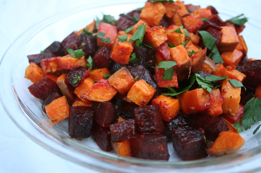 1. Preheat oven to 425°. Mix together the chicken's oil, lemon juice and herbs. Place the chicken in a large roasting pan, make a few slits in the top of the skin near the inside edge and evenly stuff the oil mixture under the skin then put the skin back in place. Place the pan in the oven and bake for 20 minutes. Now remove the chicken, reduce the heat to 350° and place the herbs around the chicken then lay the vegetables on top and return to the oven for 70 minutes. At this point toss the beets and yams in their oil and seasonings on a parchment lined baking sheet and insert into the oven. Stir both sets of vegetables about halfway through so they all roast evenly.