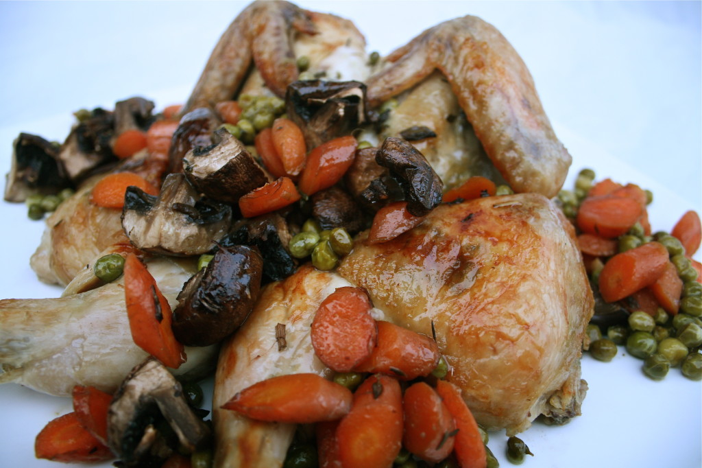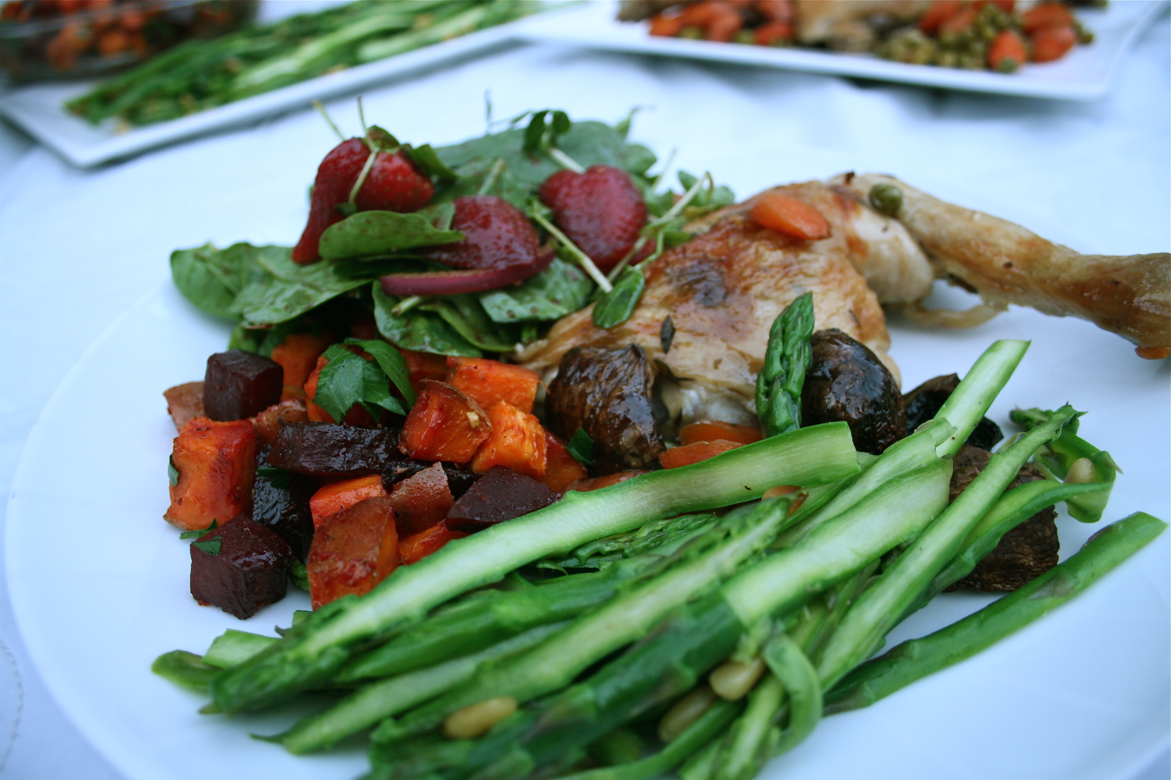 Rainbow Roast Chicken MealTraditional meals with my family are centered around the meat, and there is always lots of it. Then, in keeping with a strict shades of white and beige theme, there are piles of white flour buns, ground meat stuffing and mashed potatoes with a very small side of rather lackluster vegetables that get drowned in gravy. I know better than to mess with this formula on special holidays, but when I am putting on a family meal otherwise I like to transfer the emphasis to a rainbow of fruits and vegetables, with the meat as more of a side dish, and include some nuts and/or seeds any maybe whole grains like brown rice or quinoa. A meal like this will nourish everyone at the table and energize, rather than weigh them down. One of the simplest food philosophies was summarized by Michael Pollen when he said “Eat food. Not too much. Mostly plants.” It is something to keep in mind, even at family gatherings. Children can adopt a lifelong appreciation of nutrient rich foods (including vegetables) when it is a constant in their home, especially if they get to be involved in the prep. For the adults and elders preventing or fighting the many life affecting and potentially fatal dietary caused diseases, more plants can only help. In a time filled with short cuts, premade food products and busy schedules, coming together over a meal with fresh, real, whole food ingredients can be an integral part of finding balance and true wellness. If you are not used to working with whole birds it is easiest to get whole chickens butterflied- the backbone is removed and the chicken is opened like a book- there is no mess nor any organs to remove, although there will be no cavity for stuffing. Most whole chickens available are around 3 pounds and conventionally raised options cost around 10 dollars whereas free-range birds fed a natural diet and not injected with antibiotics, hormones or water cost around 25-30 dollars- a steep price incline reflecting how expensive and time, space and care intensive traditional farming (versus factory farming) is. The good news is that in large health food stores these higher quality birds go on sale for 10-15 dollars regularly, when this happens I get a few extra and store them in the freezer where they will last for a couple months. A great thing about cooking a whole bird is that the carcass can be used afterwards to make broth filled with important minerals. The free range birds that walked and hopped, and sometimes strutted, have stronger, more nutrient filled bones, caused by the constant impact from daily life (this happens in humans who exercise regularly too). Unfortunately, the bones are a storage site for chemicals and toxins so making broth from lower quality chickens will end up in less of the good stuff and an addition of some bad stuff. For bigger groups two chickens can be cooked at once, each in their own pan in the middle of the oven for the same length of time. To test for doneness make a small slit in the thickest part of a thigh and if the juices that run out are clear it is done and you are in the clear for salmonella, there should be no pink left anywhere in the meat but this requires larger cuts to determine. I like to cook the whole birds at a high heat first to crisp up the skin and seal in the juices then reduce the heat for the duration of cooking so it does not dry out. Generally the rule of thumb is to cook it for 20 minutes per pound, with an extra 20 minutes.