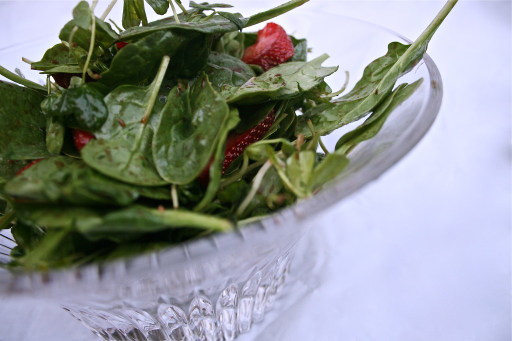 2. When there are around 15 minutes left in the baking time toss all the salad ingredients together in a large bowl and whisk the dressing together in a separate small bowl, keep the dressing separate until just before serving. When there is around 5 minutes left heat up a large skillet on the stove over medium high heat with the oil for the asparagus. Once it is warm add in the pine nuts and asparagus and sautée until the nuts are slightly browned and the asparagus has softened, for around 5 minutes. If the skillet becomes too dry add in a splash or two of water. When the chicken is done remove it from the oven and set it aside to cool for a few minutes before serving. Toss the salad with its dressing and drizzle the lemon juice over the asparagus then lightly sprinkle on the salt and pepper. Serve everything hot, family style on the table is easiest and more interactive than plating the food individually.