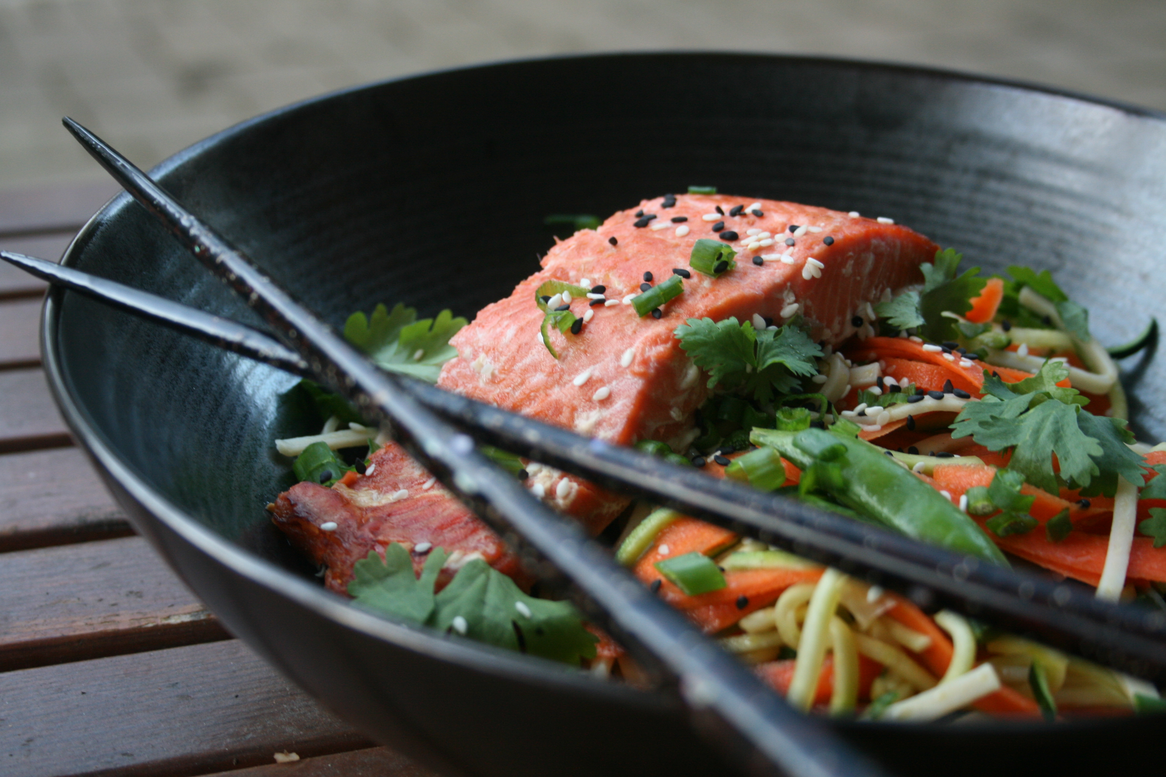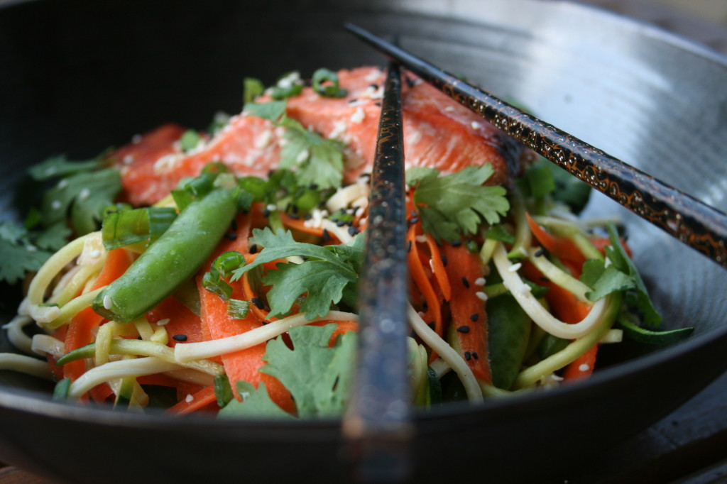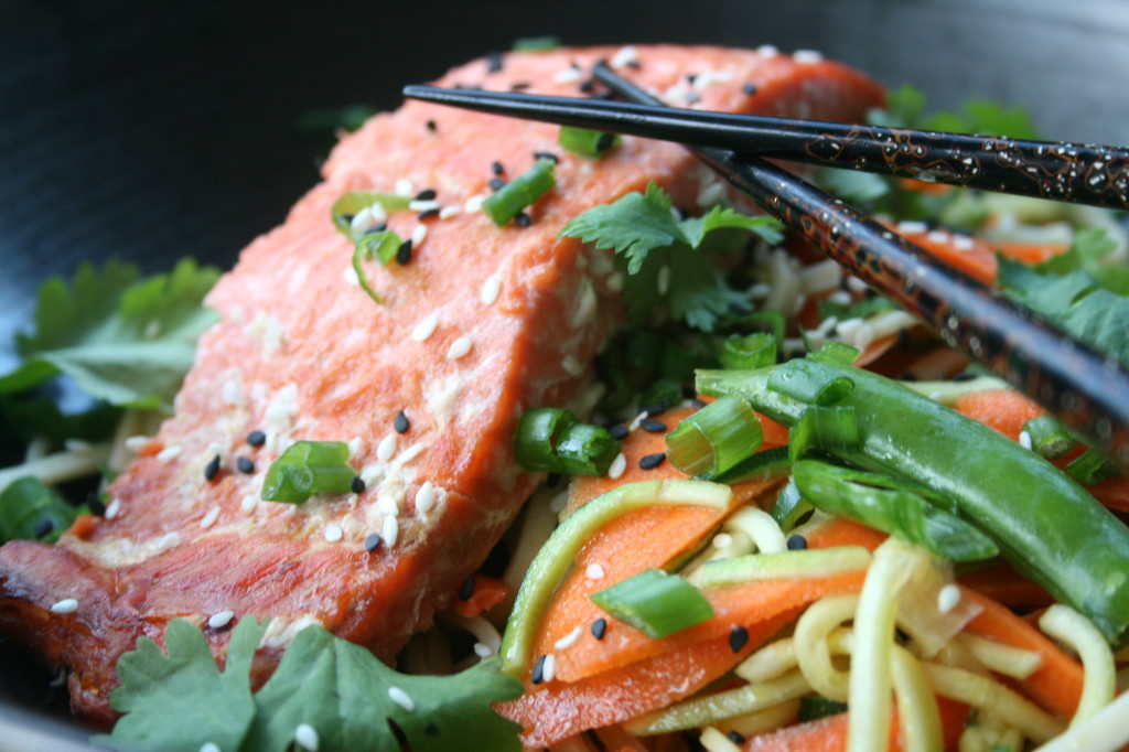 - When the salmon is done remove it from the oven, cut it into 4 pieces and remove the skin (unless you like it). Separate the noodles into 4 bowls, place the salmon on top then add on any additional desired toppings.