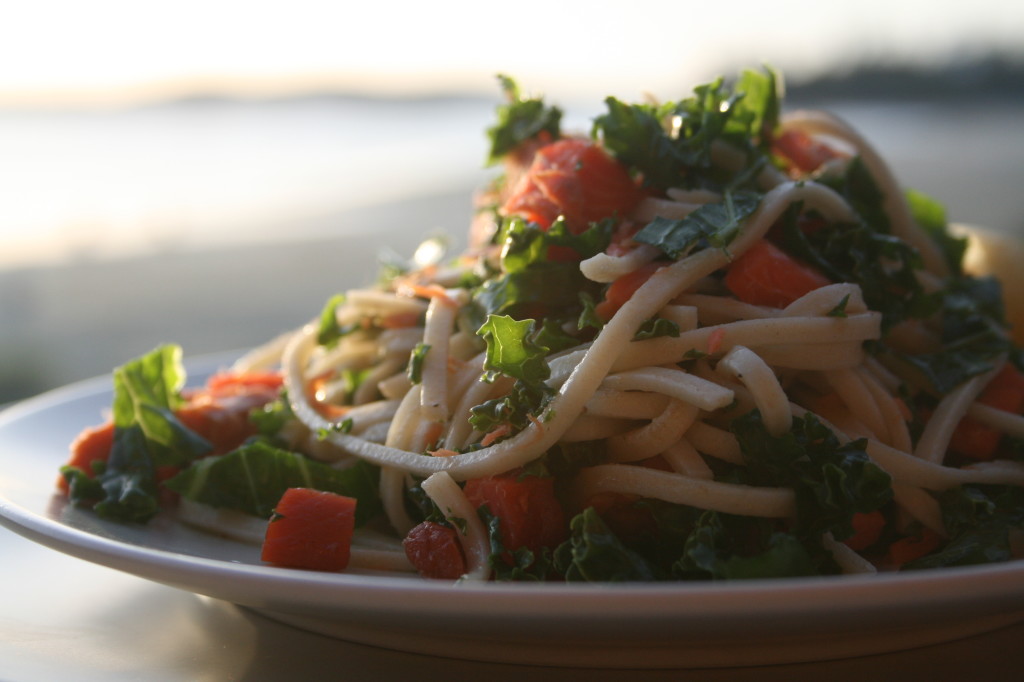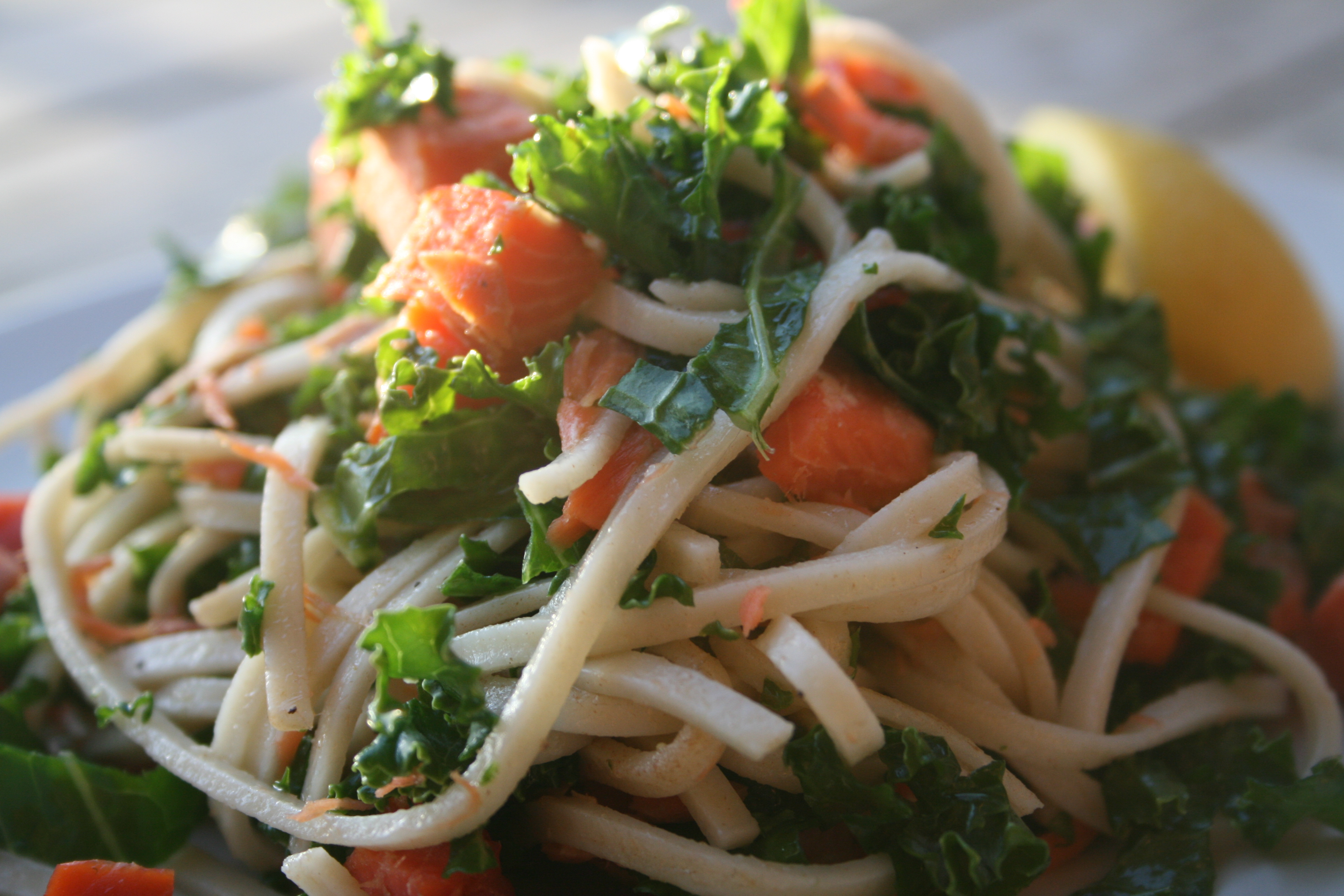 This is a rustic and simple dish so the measurements do not have to be exact. The sauce is just browned butter, (aka buerre noisette or hazelnut butter) which has an almost nutty flavor, and a bit of lemon juice so that the salmon gets to take center stage. The salmon itself will already have lots of salt from the curing and if using salted butter than that will probably provide enough, but some freshly ground black pepper can be nice. The kale adds lots of nutrients and texture and the noodles bring it all together. I used kamut udon noodles because they are very light and have a sweet and mild buttery, nutty flavor that goes well with the other ingredients; they can be found at most health food stores or substituted for any other long noodles. Kamut is simply “wheat” in ancient Egyptian but it is higher in protein and several minerals and vitamins than the regular refined wheat we consume. It qualified as an ancient grain, meaning it has not been modified at all in recent history (like our most popular strains of wheat), and consequently many people who are sensitive to modern strains may find it much easier to digest.