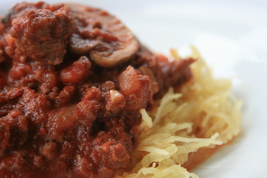 - Preheat oven to 350°. Heat a large saucepan over the stove on high heat, it must have high sides because this sauce is quite thick and will bubble and splatter a bit. Sautée the beef, bacon, onion, garlic, carrot and celery for around 10 minutes. There should be no pink left on the beef and the vegetables should be softened and fragrant. Drain any excess oil and discard. Add in the mushrooms, crushed tomatoes, water, wine, sundried tomatoes, oregano and basil. Reduce heat to low and simmer for 45 minutes to let the flavors deepen, stirring every 5-10 minutes so the bottom doesn't burn. Now for the spaghetti squash- cut each one in half, remove the seeds (I like to scrape them out with a serrated grapefruit spoon), place face down on a parchment lined baking sheet and bake for 30 minutes. Remove from oven and use oven mitts to flip them over, beware of escaping steam. Check for doneness by making sure a fork can easily pierce through to the skin in a few spots. Let them cool for a couple minutes then use a fork to scrape along from one end to the other, breaking apart the strands. Remove the sauce from the heat and stir in the honey and salt and pepper, the honey may seem a little bit odd but tomato sauce needs a bit of sweetness to be balanced out. You can serve the sauce over the squash, using the outer skin as a bowl or put it all on a plate.