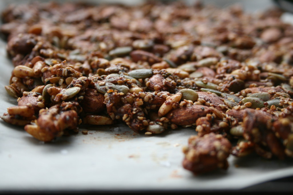 - Preheat oven to 300°. Whisk the egg whites until they become a bit frothy and then stir in the spices. Fold in all the nuts and seeds until the egg mixture is evenly distributed. Pour the nut mixture onto a parchment lined baking sheet and make sure everything is touching in a thin layer. Bake for 30 minutes, remove from oven and let cool completely before breaking into small clusters.