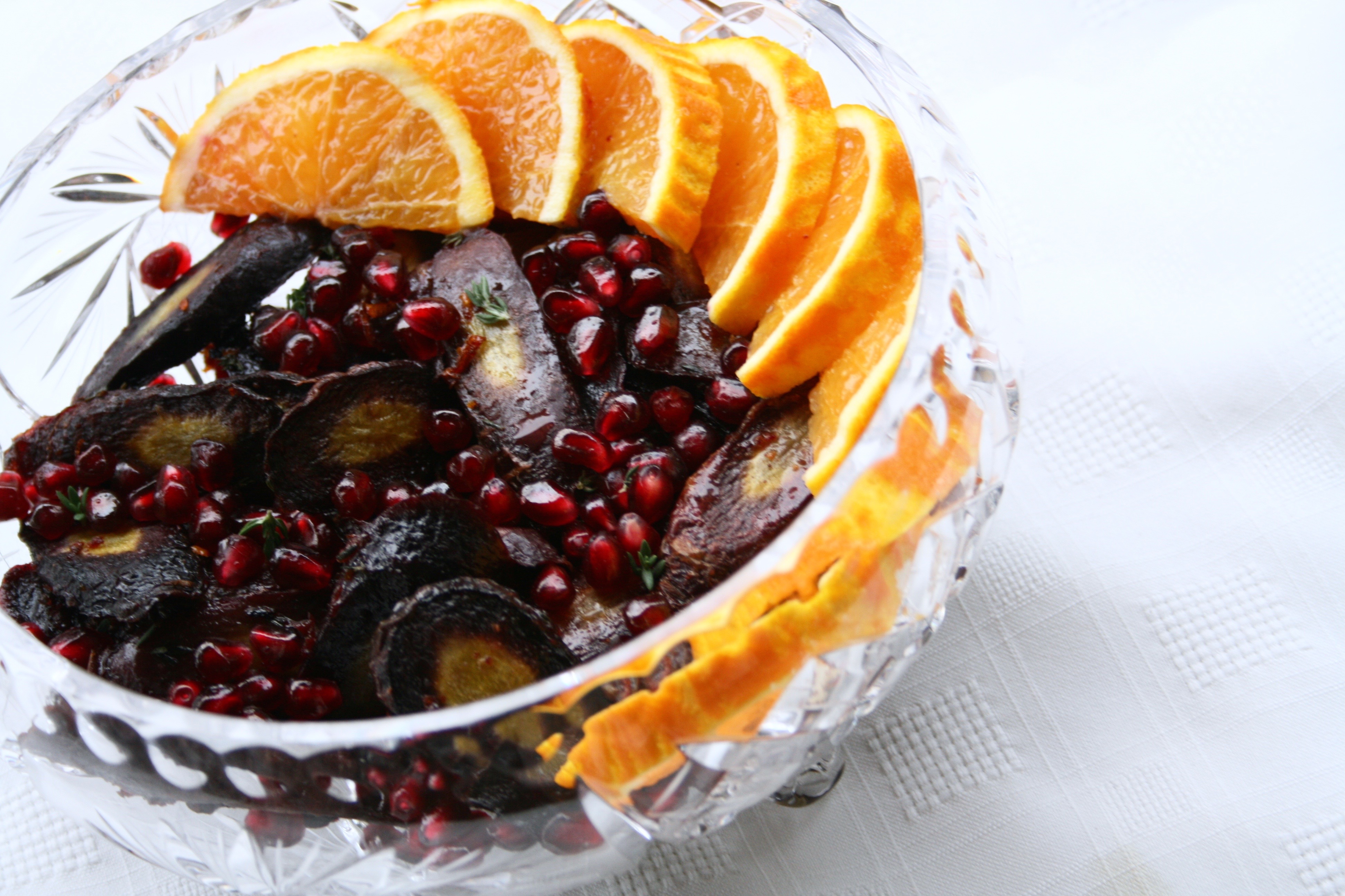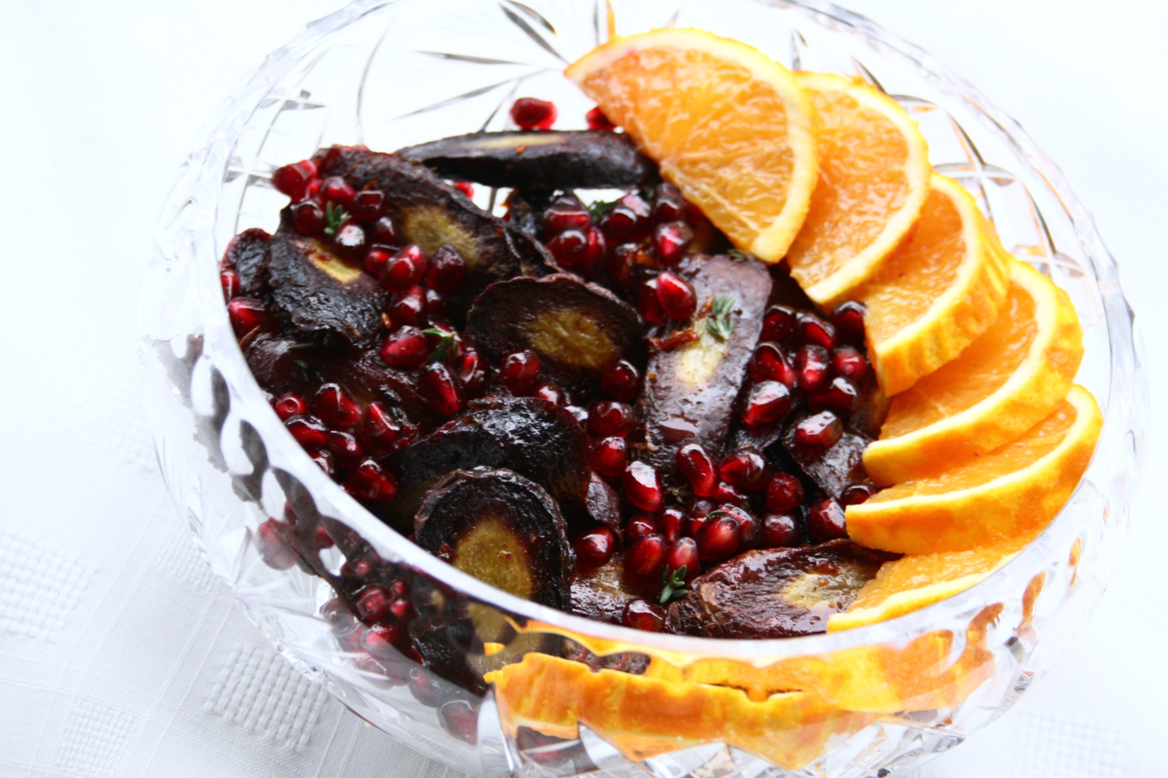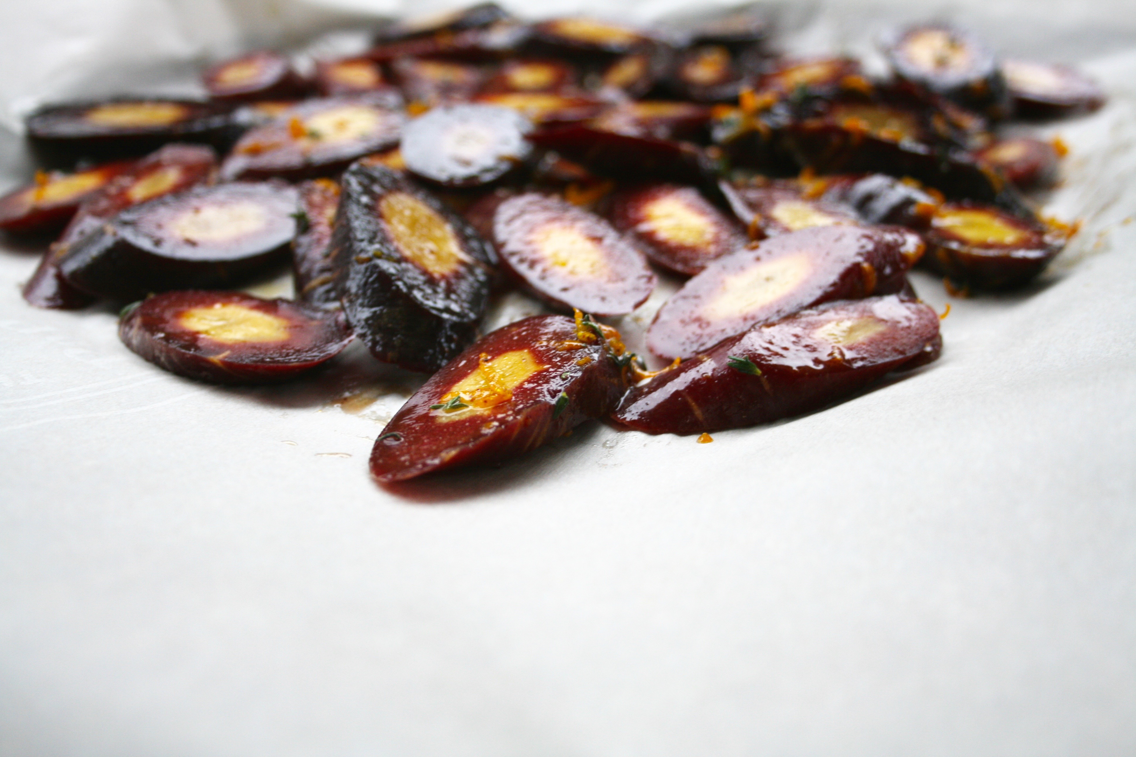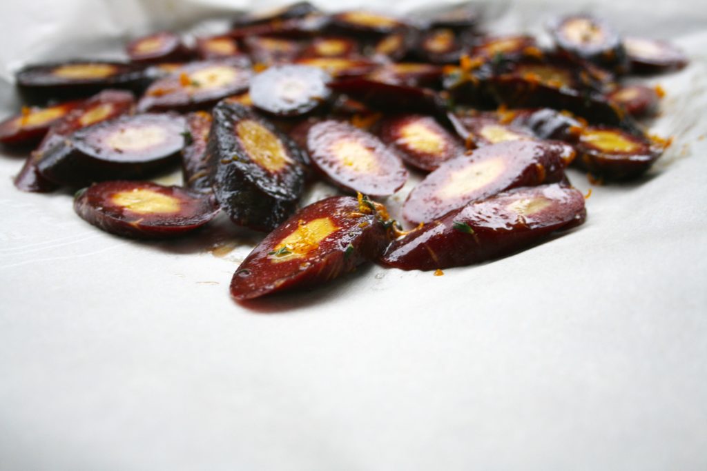 Sumac Thyme Orange Roasted CarrotsCarrots are one of the few vegetables that tend to appeal to picky eaters. Their natural sweetness and soft texture once cooked make them a versatile side dish. The flavour really comes out through roasting and adding in some citrusy and earthy spices gives them a bit more flavour. They’re a mandatory side dish for turkey dinners in my family and for the occasion I added in some pomegranate seeds. I love both cranberry and pomegranate with poultry so I like to incorporate them into the side dishes whenever possible; they also go really well with roasted bacon and balsamic brussels sprouts.Sumac Thyme Orange Roasted Carrots