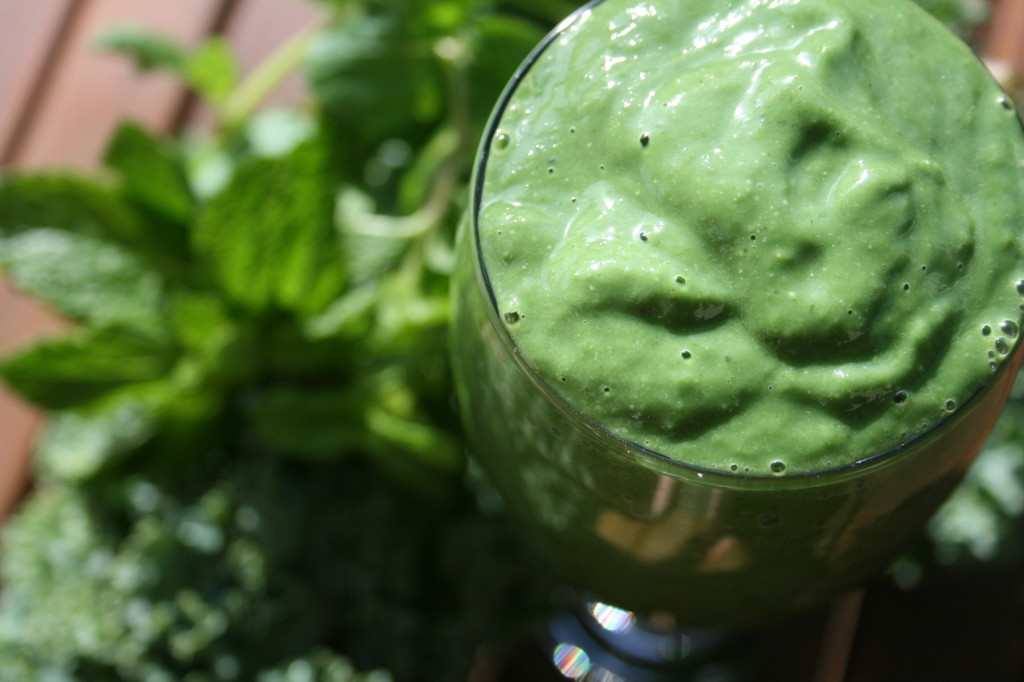 1. Blend together the kale, mint and coconut water until the greens are fully broken down. Add in all the other ingredients and blend until fully mixed.