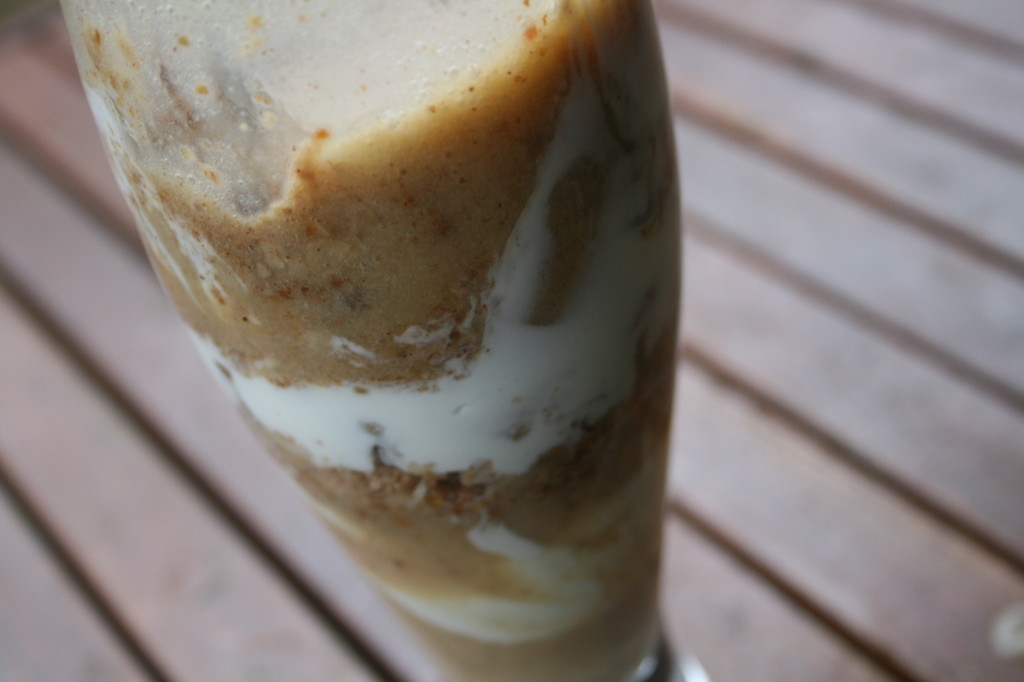 1. Blend the smoothie ingredients and then pour half into a tall, narrow glass. Top with half of the yogurt then half of the granola, then the second half of yogurt and the second half of the granola. Top off with the rest of the smoothie and a spoonful of granola.