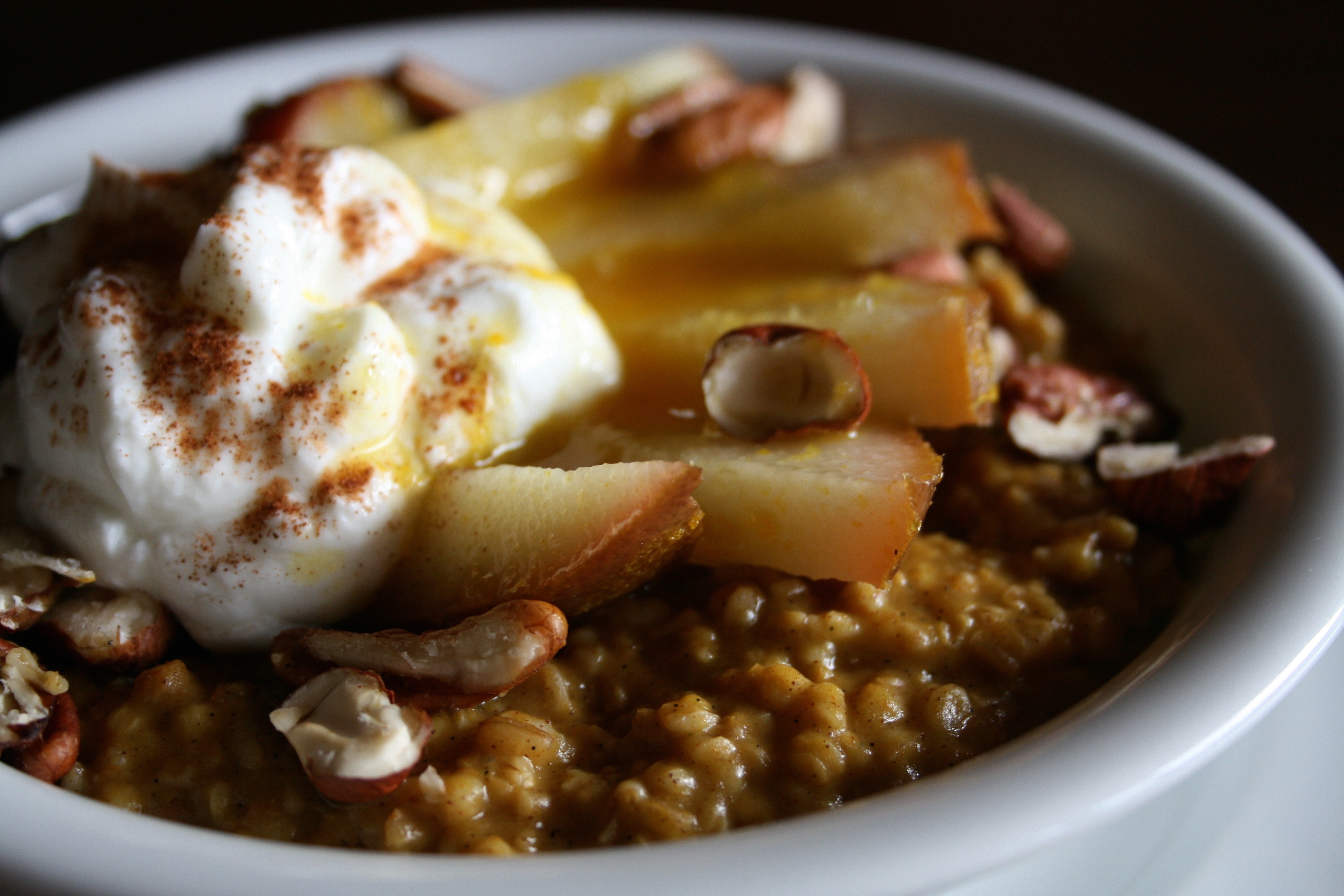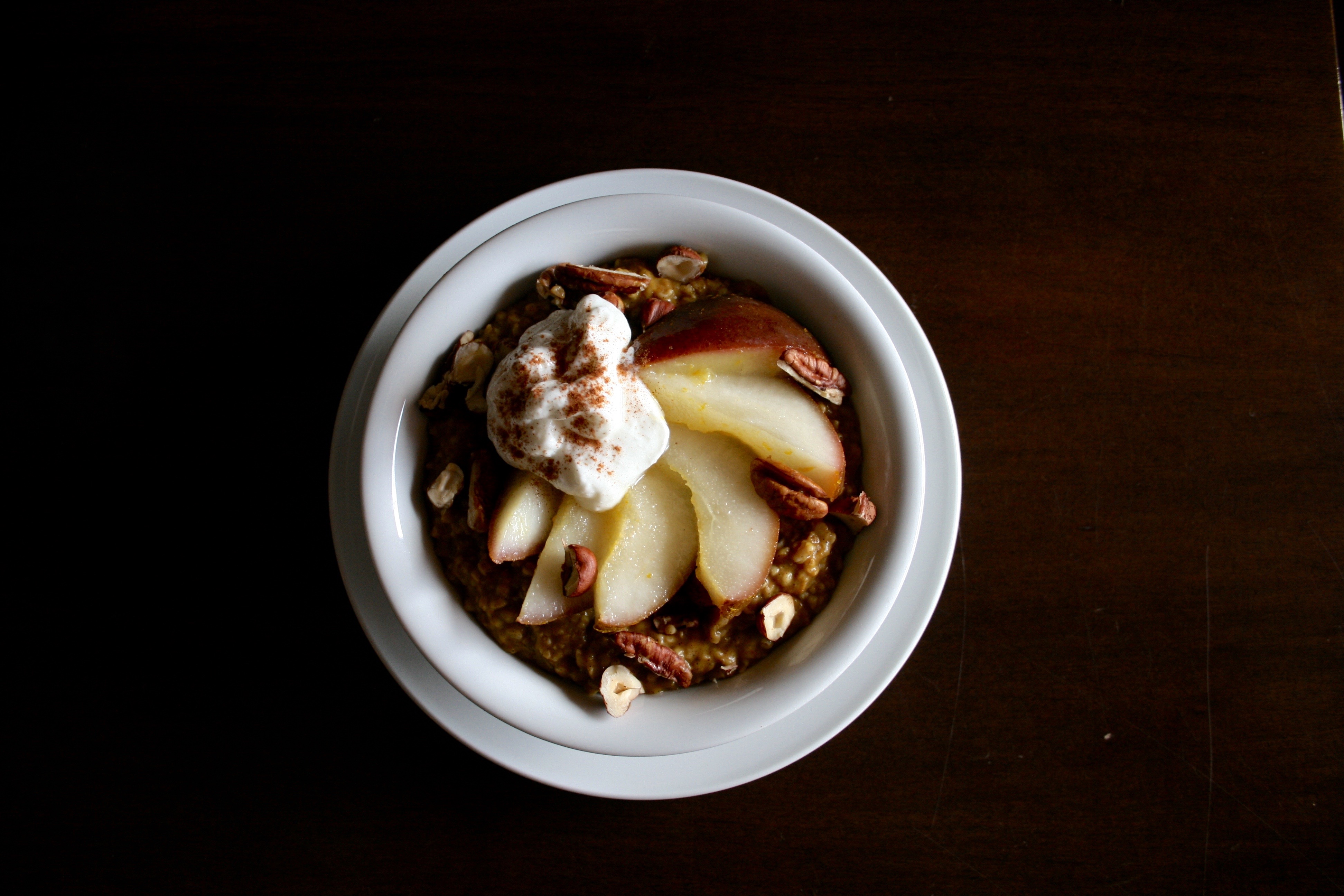 Adding fruit to oatmeal gives it some sweetness without having to use refined or concentrated sugars. Poaching pears in orange juice and zest with some ginger makes them tender and succulent and keeps the dish seasonal. The orange juice cooks down and becomes a sweet glaze while the ginger adds in a burst of sharp flavour. Ginger is one of my favourite cold weather spices. It has a warming effect on the body and it helps with digestion, a process that can become a bit sluggish as we enjoy the heavier foods of fall and winter. Its medicinal properties have been appreciated for many thousands of years all around the world and gained endorsements from Confucius, Dioscorides and Pliny and mentions in the Kama Sutra and Koran.