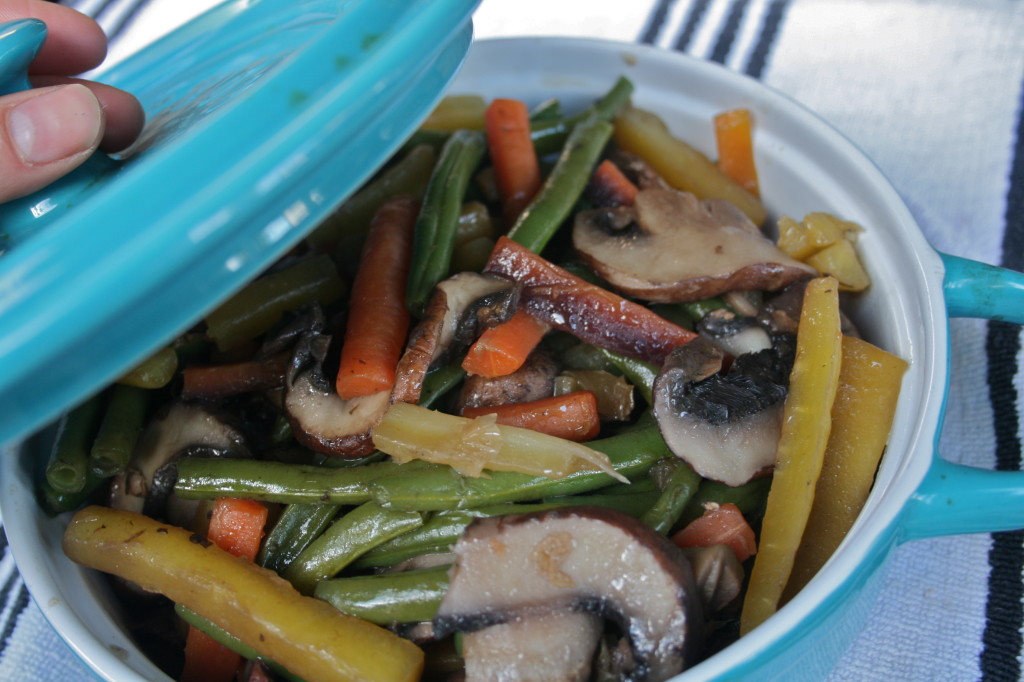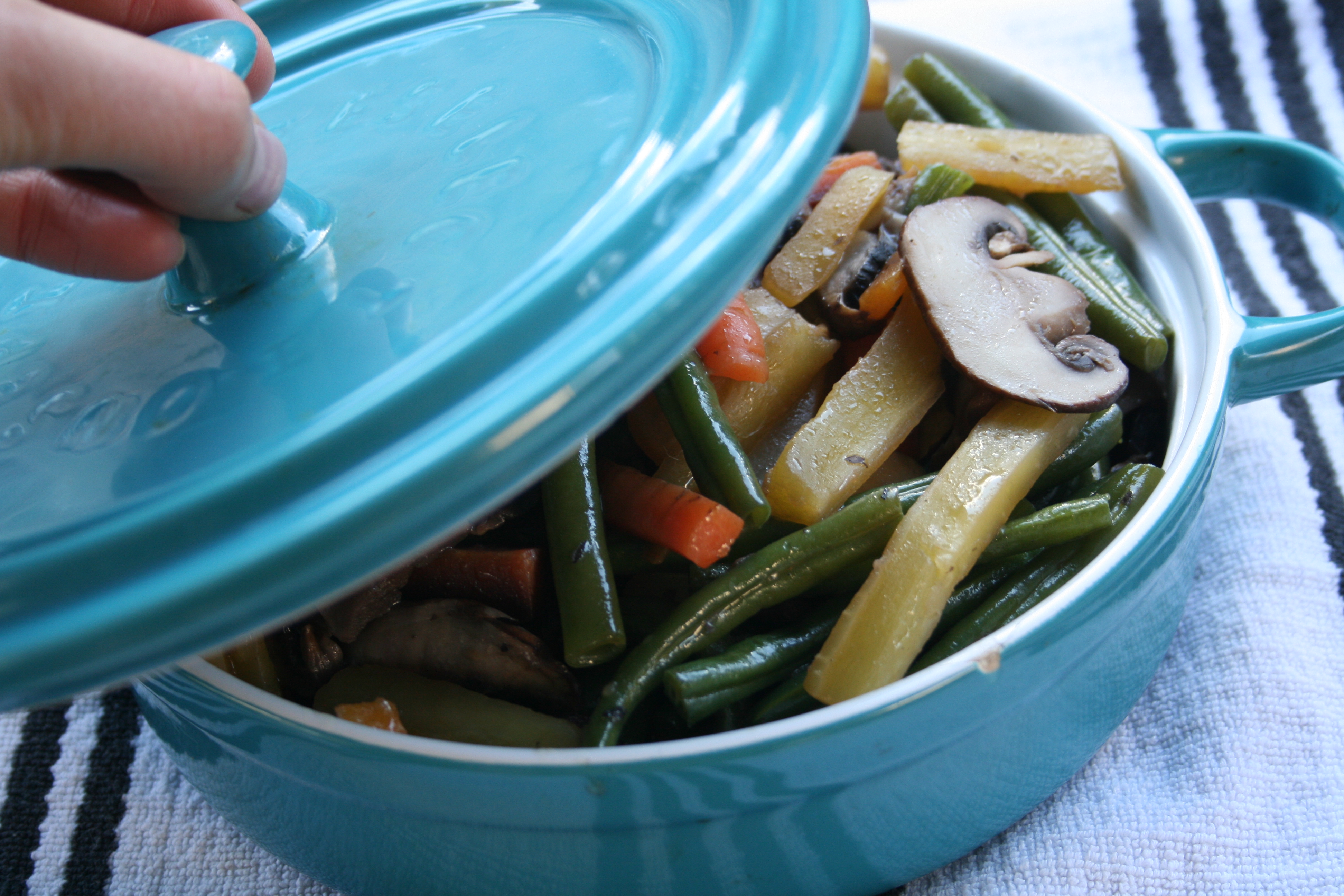Back when I was younger and before I started liking vegetables I loved this dish. It actually got me excited to eat them, the combination of rich butter (or olive oil) and smoky dried thyme transforms the vegetables to become a medley much better than the sum of its parts. I made it recently for a family dinner and not only were my brothers visibly stoked for it but our parents showed some enthusiasm too. All four of them are generally against vegetables unless they are completely drenched in creamy or cheesy dressing, so any dish that gets them to eat vegetables that are visibly vegetables is a near miracle. I didn’t make this recipe up, it came from my Aunt Karen, a lovely lady and fabulous cook. The mushrooms can be subbed for any kind desired and the butter can be exchanged for cold-pressed olive oil for dairy-free. This is hearty enough for fall and winter but when made with the tender carrots and fresh green beans of spring it is particularly delicious, and tri-coloured carrot bunches (a combination of orange, yellow and purple carrots) adds some extra vibrancy.